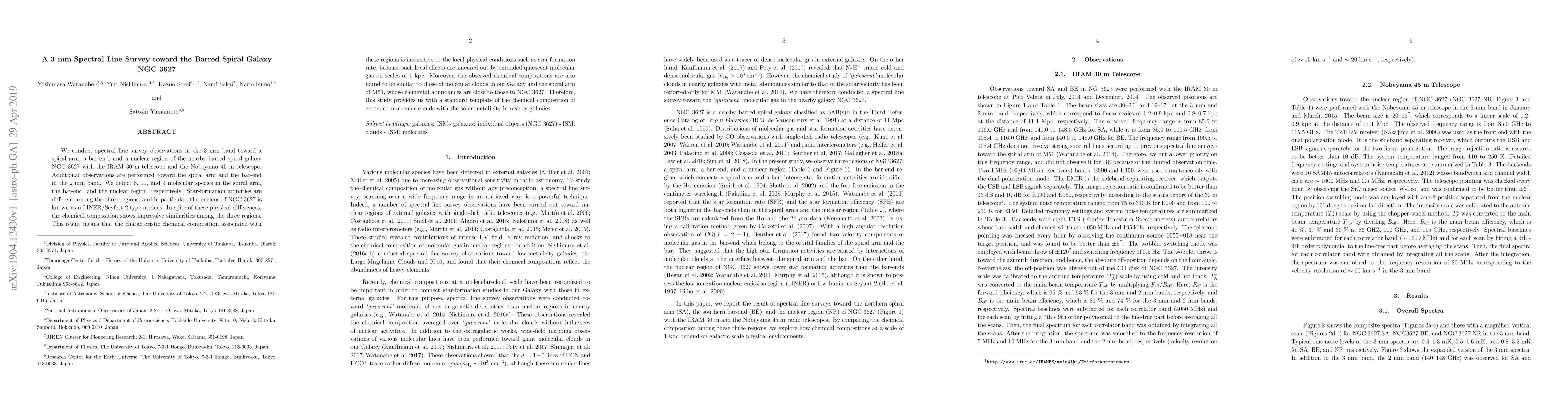This study uses 3 mm and 2 mm spectral line surveys to analyze the molecular composition in different regions of NGC 3627, revealing similar chemical compositions despite varying star-formation activities. The findings suggest that local physical conditions do not significantly affect the chemical makeup, providing a standard template for solar metallicity in nearby galaxies.