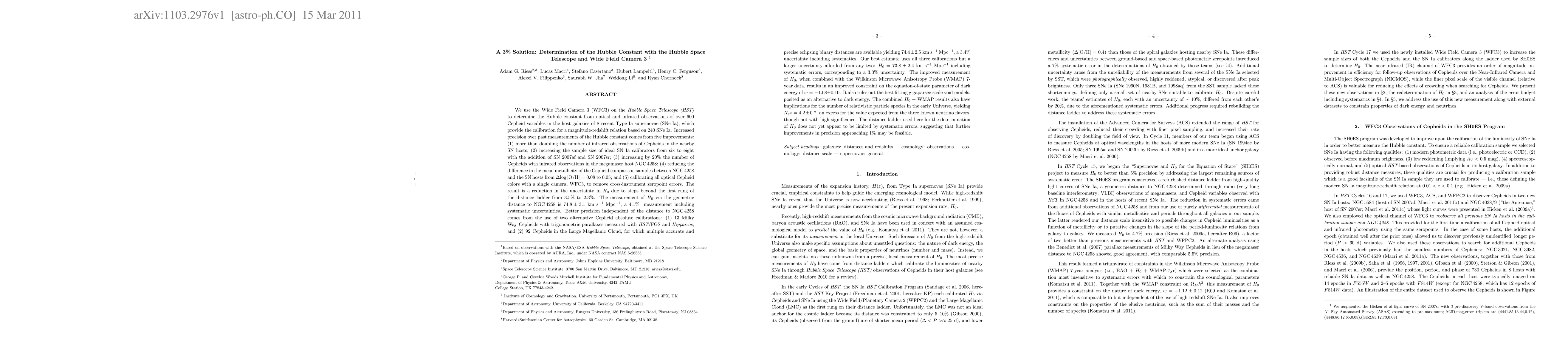 We use the Wide Field Camera 3 (WFC3) on the Hubble Space Telescope to determine the Hubble constant (H0) from optical and infrared observations of over 600 Cepheid variables in the host galaxies of 8 recent Type Ia supernovae (SNe Ia), providing the calibration for a mag-z relation of 253 SNe Ia. Increased precision over past measurements comes from: (1) more than doubling the number of infrared observations of Cepheids in nearby SN hosts; (2) increasing the sample of ideal SN Ia calibrators from six to eight; (3) increasing by 20% the number of Cepheids with infrared observations in the megamaser host NGC 4258; (4) reducing the difference in the mean metallicity of the Cepheid comparison samples from \Delta log [O/H] = 0.08 to 0.05; and (5) calibrating all optical Cepheid colors with one camera, WFC3, to remove cross-instrument zero-point errors. Uncertainty in H0 from beyond the 1st rung of the distance ladder is reduced from 3.5% to 2.3%. The measurement of H0 via the geometric distance to NGC 4258 is 74.8 \pm 3.1 km s- 1 Mpc-1, a 4.1% measurement including systematics. Better precision independent of NGC 4258 comes from two alternative Cepheid absolute calibrations: (1) 13 Milky Way Cepheids with parallaxes and (2) 92 Cepheids in the Large Magellanic Cloud with multiple eclipsing binary distances, yielding 74.4 \pm 2.5 km s- 1 Mpc-1, a 3.4% uncertainty with systematics. Our best estimate uses all three calibrations but a larger uncertainty afforded from any two: H0 = 73.8 \pm 2.4 km s- 1 Mpc-1 including systematics, a 3.3% uncertainty. The improvement in H0, combined with WMAP7yr data, results in a constraint on the EOS parameter of dark energy of w = -1.08 \pm 0.10 and Neff = 4.2 \pm 0.7 for the number of relativistic species in the early universe. It also rules out the best-fitting gigaparsec-scale void models, posited as an alternative to dark energy. (abridged)
