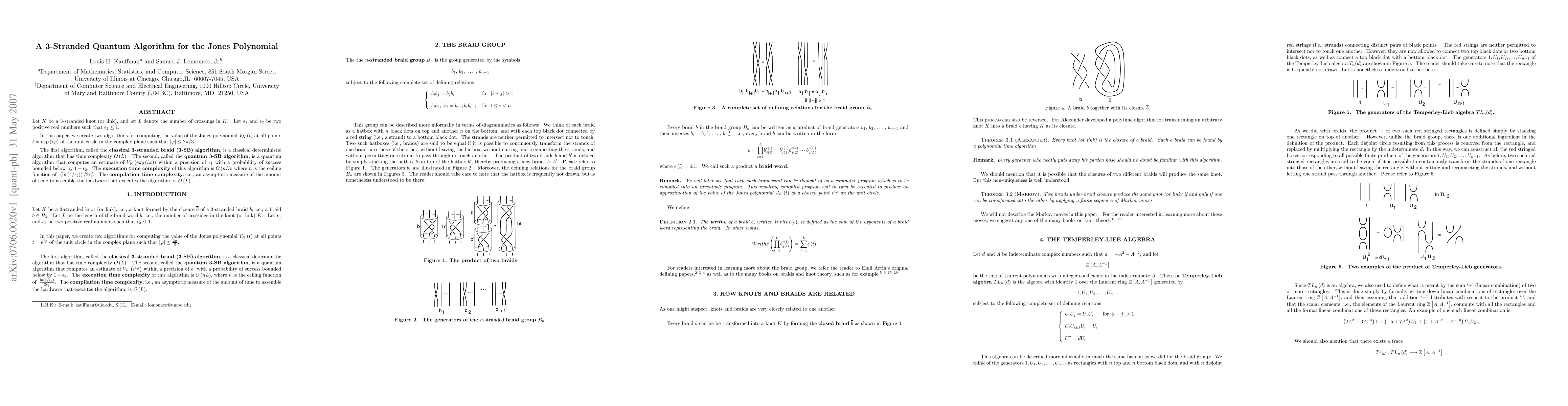 Let K be a 3-stranded knot (or link), and let L denote the number of crossings in K. Let $\epsilon_{1}$ and $\epsilon_{2}$ be two positive real numbers such that $\epsilon_{2}$ is less than or equal to 1. In this paper, we create two algorithms for computing the value of the Jones polynomial of K at all points $t=exp(i\phi)$ of the unit circle in the complex plane such that the absolute value of $\phi$ is less than or equal to $\pi/3$. The first algorithm, called the classical 3-stranded braid (3-SB) algorithm, is a classical deterministic algorithm that has time complexity O(L). The second, called the quantum 3-SB algorithm, is a quantum algorithm that computes an estimate of the Jones polynomial of K at $exp(i\phi))$ within a precision of $\epsilon_{1}$ with a probability of success bounded below by $1-\epsilon_{2}%. The execution time complexity of this algorithm is O(nL), where n is the ceiling function of (ln(4/\epsilon_{2}))/(2(\epsilon_{2})^2). The compilation time complexity, i.e., an asymptotic measure of the amount of time to assemble the hardware that executes the algorithm, is O(L).