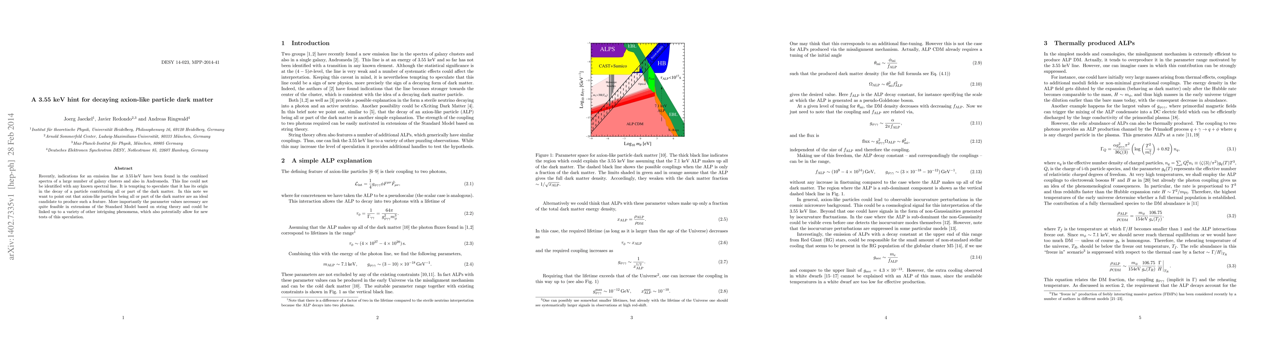 Recently, indications for an emission line at 3.55 keV have been found in the combined spectra of a large number of galaxy clusters and also in Andromeda. This line could not be identified with any known spectral line. It is tempting to speculate that it has its origin in the decay of a particle contributing all or part of the dark matter. In this note we want to point out that axion-like particles being all or part of the dark matter are an ideal candidate to produce such a feature. More importantly the parameter values necessary are quite feasible in extensions of the Standard Model based on string theory and could be linked up to a variety of other intriguing phenomena, which also potentially allow for new tests of this speculation.