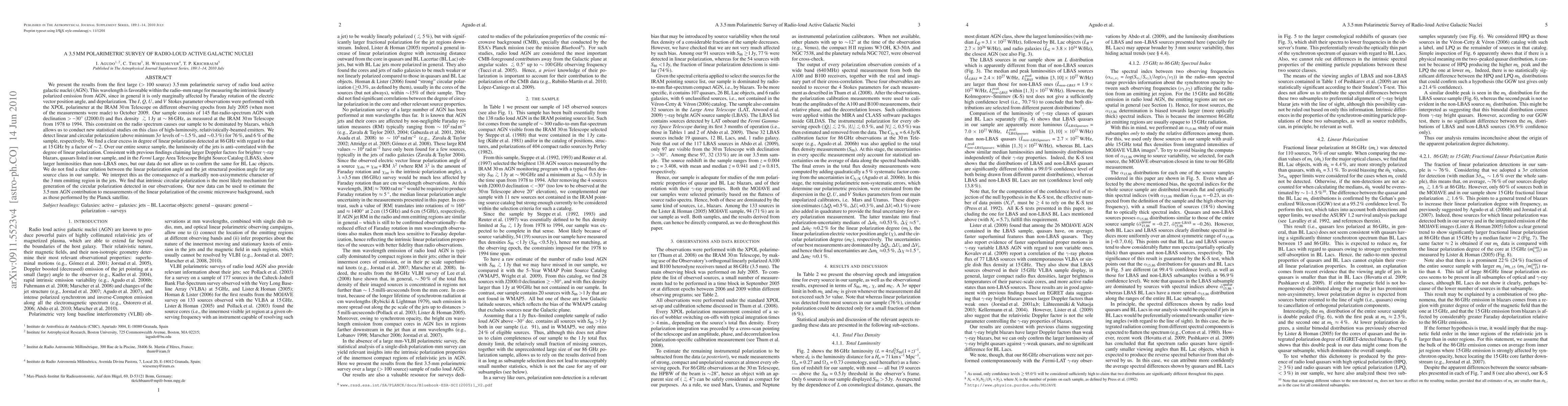 We present the results from the first large (>100 source) 3.5 mm polarimetric survey of radio loud active galactic nuclei (AGN). The I, Q, U, and V Stokes parameter observations were performed with the XPOL polarimeter at the IRAM 30m Telescope. Our sample consists of 145 flat-radio-spectrum AGN with declination >-30 deg. (J2000.0) and flux density >~1Jy at 86GHz, as measured at the IRAM 30 m Telescope from 1978 to 1994. We detected linear and circular polarization (above 3 sigma levels of ~1.6%, and ~0.3%) for 76%, and 6% of the sample, respectively. We find a clear excess in degree of linear polarization detected at 86 GHz with regard to that at 15 GHz by a factor of ~2. Over our entire source sample, the luminosity of the jets is inversely proportional to the degree of linear polarization. Consistent with previous findings claiming larger Doppler factors for brighter gamma-ray blazars, quasars listed in our sample, and in the Fermi-LBAS catalog, show larger luminosities than non-LBAS ones, but our data do not allow us to confirm the same for BL Lac objects. We do not find a clear relation between the linear polarization angle and the jet structural position angle for any source class in our sample. We interpret this as the consequence of a markedly non-axisymmetric character of the 3 mm emitting region in the jets. We find that intrinsic circular polarization is the most likely mechanism for generation of the circular polarization detected in our observations. Our new data can be used to estimate the 3 mm AGN contribution to measurements of the linear polarization of the cosmic microwave background, such as those performed by the Planck satellite.