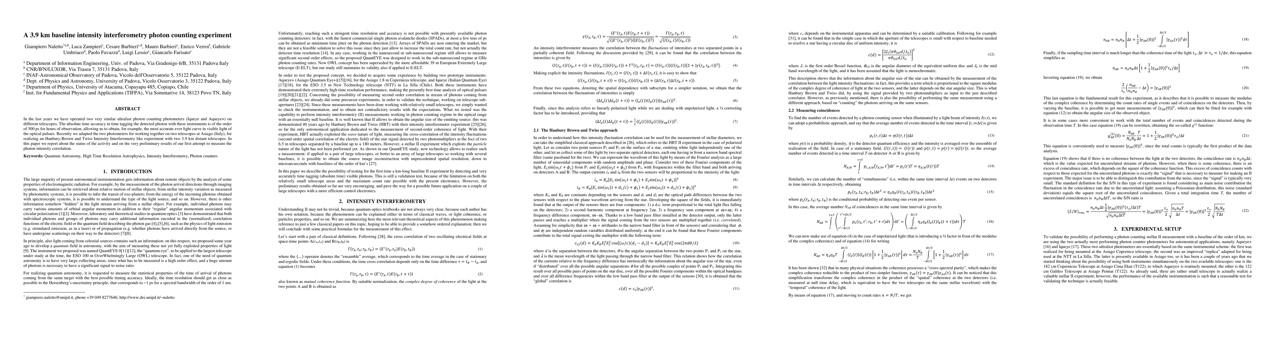 In the last years we have operated two very similar ultrafast photon counting photometers (Iqueye and Aqueye+) on different telescopes. The absolute time accuracy in time tagging the detected photon with these instruments is of the order of 500 ps for hours of observation, allowing us to obtain, for example, the most accurate ever light curve in visible light of the optical pulsars. Recently we adapted the two photometers for working together on two telescopes at Asiago (Italy), for realizing an Hanbury-Brown and Twiss Intensity Interferometry like experiment with two 3.9 km distant telescopes. In this paper we report about the status of the activity and on the very preliminary results of our first attempt to measure the photon intensity correlation.
