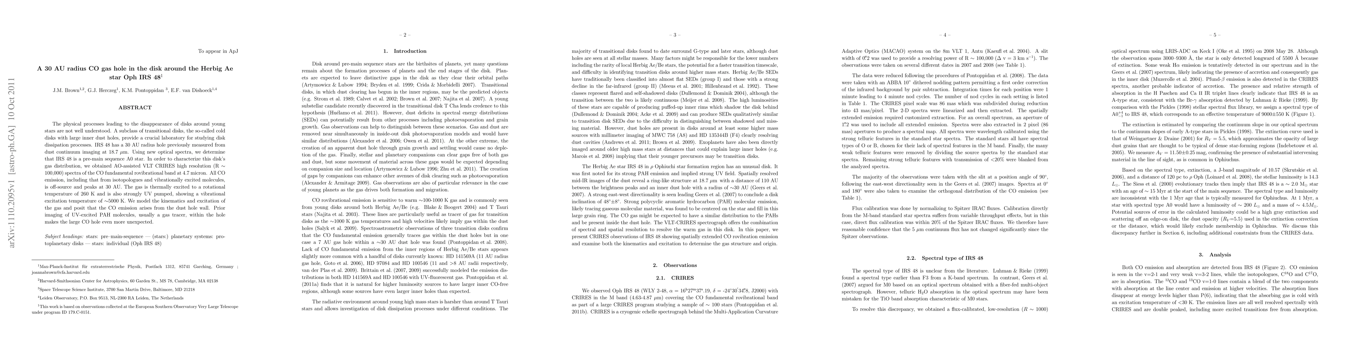 The physical processes leading to the disappearance of disks around young stars are not well understood. A subclass of transitional disks, the so-called cold disks with large inner dust holes, provide a crucial laboratory for studying disk dissipation processes. IRS 48 has a 30 AU radius hole previously measured from dust continuum imaging at 18.7 micron. Using new optical spectra, we determine that IRS 48 is a pre-main sequence A0 star. In order to characterize this disk's gas distribution, we obtained AO-assisted VLT CRIRES high resolution (R ~100,000) spectra of the CO fundamental rovibrational band at 4.7 micron. All CO emission, including that from isotopologues and vibrationally excited molecules, is off-source and peaks at 30 AU. The gas is thermally excited to a rotational temperature of 260 K and is also strongly UV pumped, showing a vibrational excitation temperature of ~5000 K. We model the kinematics and excitation of the gas and posit that the CO emission arises from the dust hole wall. Prior imaging of UV-excited PAH molecules, usually a gas tracer, within the hole makes the large CO hole even more unexpected.