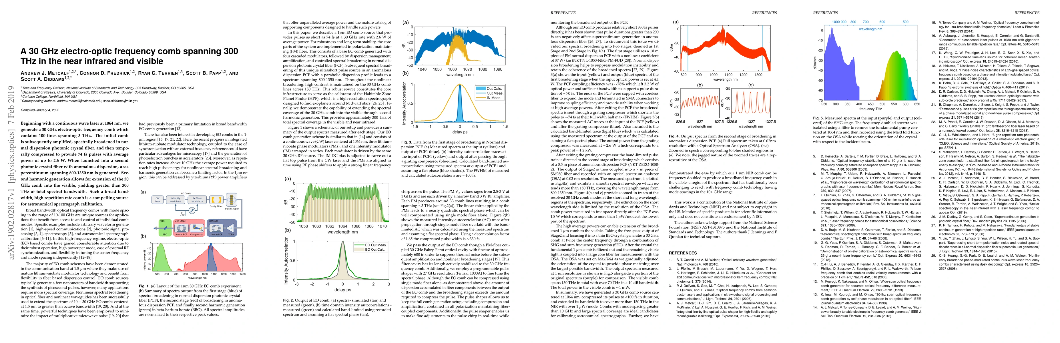 The research paper describes the generation of a 30 GHz electro-optic frequency comb, initially from a 1064 nm laser, amplified, and broadened to produce 74 fs pulses. The comb is extended into the visible via second harmonic generation, resulting in a supercontinuum spanning 800-1350 nm and a total spectral bandwidth exceeding 300 THz, suitable for astronomical spectrograph calibration.