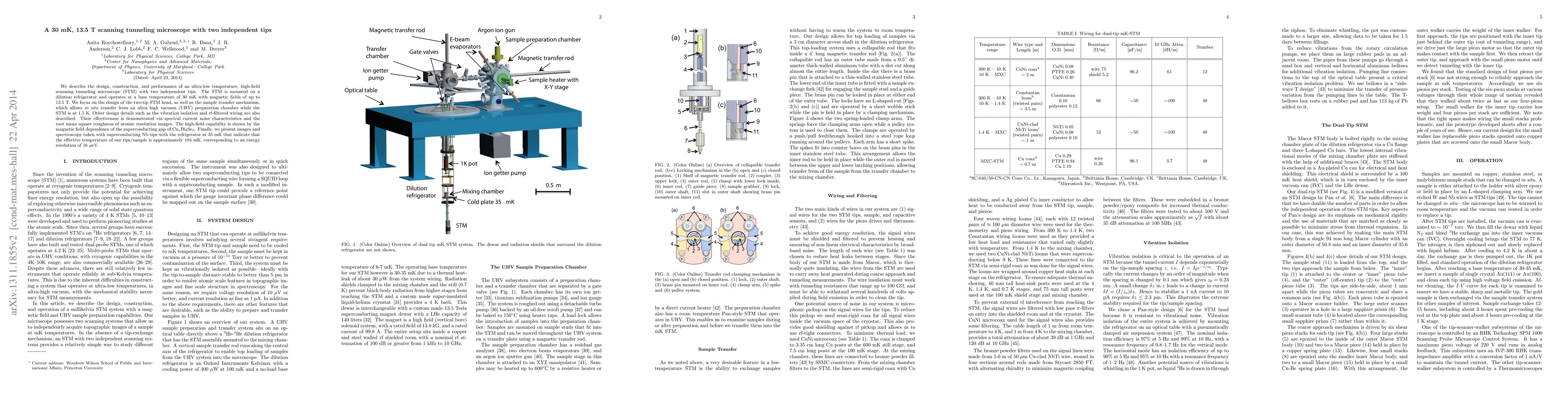 We describe the design, construction, and performance of an ultra-low temperature, high-field scanning tunneling microscope (STM) with two independent tips. The STM is mounted on a dilution refrigerator and operates at a base temperature of 30 mK with magnetic fields of up to 13.5 T. We focus on the design of the two-tip STM head, as well as the sample transfer mechanism, which allows \textit{in situ} transfer from an ultra high vacuum (UHV) preparation chamber while the STM is at 1.5 K. Other design details such as the vibration isolation and rf-filtered wiring are also described. Their effectiveness is demonstrated via spectral current noise characteristics and the root mean square roughness of atomic resolution images. The high-field capability is shown by the magnetic field dependence of the superconducting gap of $\text{Cu}_x\text{Bi}_2\text{Se}_3$. Finally, we present images and spectroscopy taken with superconducting Nb tips with the refrigerator at 35 mK that indicate that the effective temperature of our tips/sample is approximately 184 mK, corresponding to an energy resolution of 16 $\mu$eV.