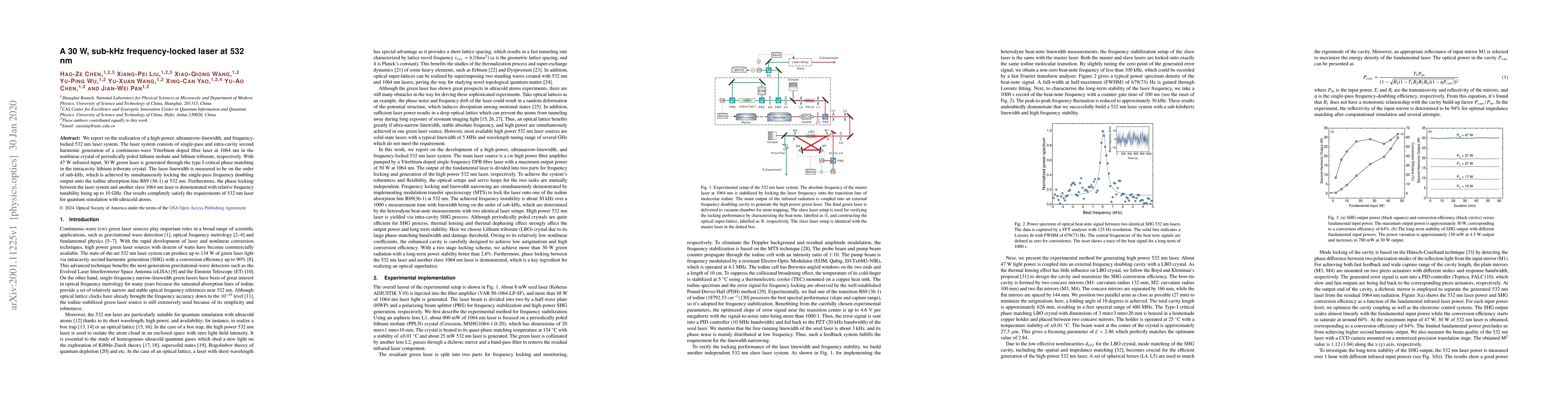 This paper describes a high-power, sub-kHz linewidth laser system that generates 30 W at 532 nm through frequency-locked second harmonic generation of a 47 W Ytterbium doped fiber laser. The laser's phase is locked to an iodine absorption line, meeting quantum simulation requirements for ultracold atoms.