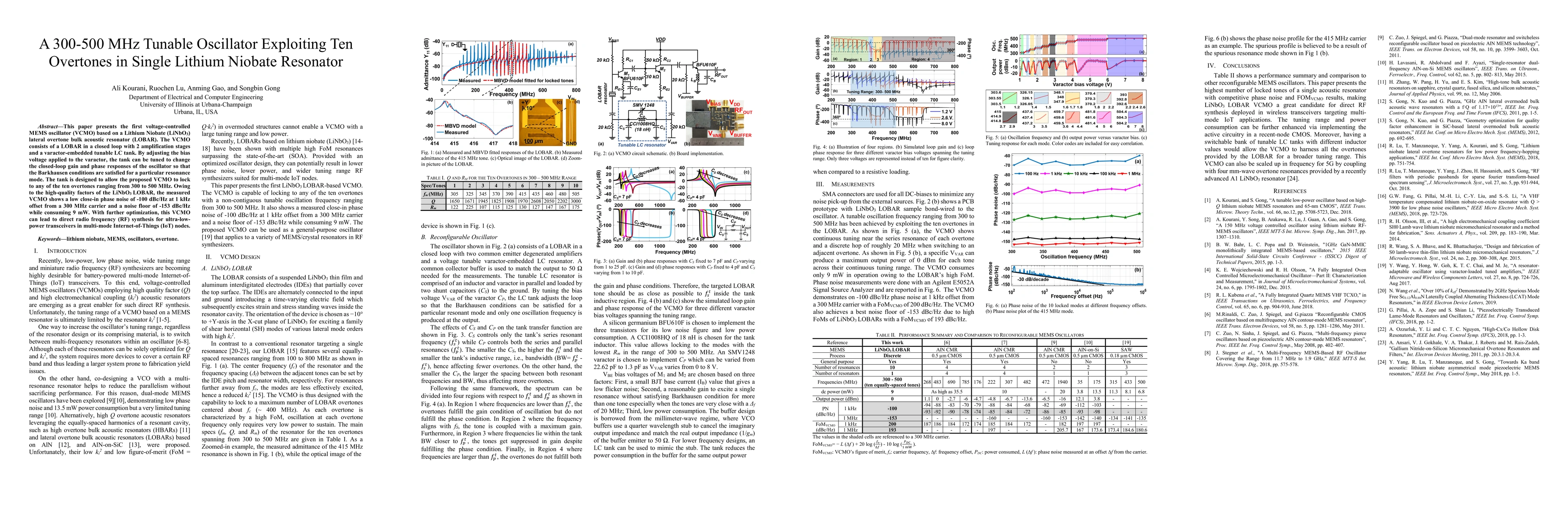 This paper introduces a voltage-controlled MEMS oscillator utilizing a Lithium Niobate resonator that can tune across ten overtones from 300 to 500 MHz, achieving low phase noise and high-quality factors, potentially enabling low-power RF synthesis in IoT devices.