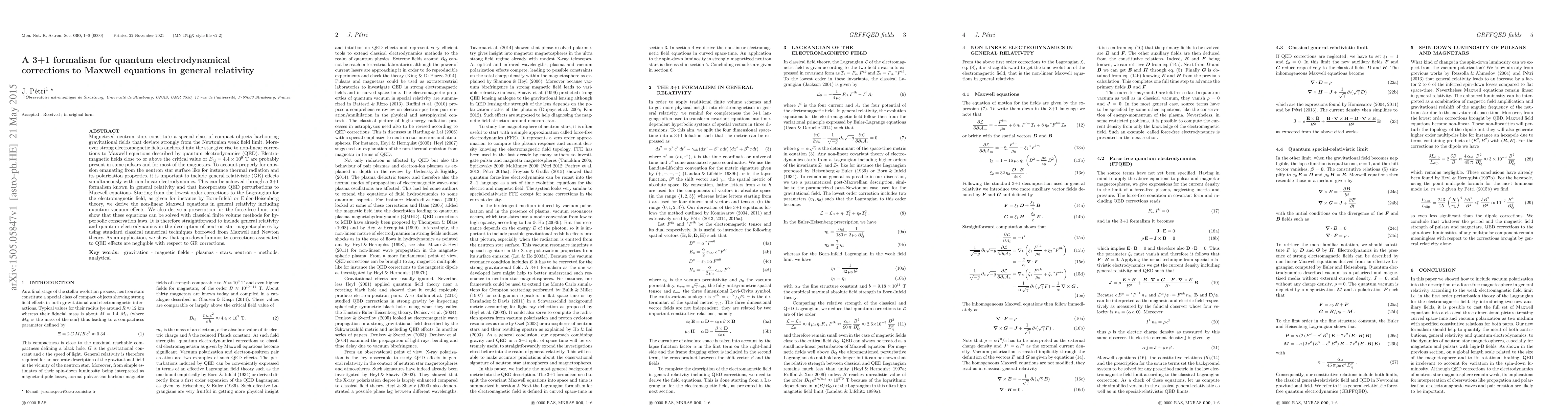 This paper develops a 3+1 formalism to incorporate quantum electrodynamical corrections to Maxwell's equations in general relativity, focusing on magnetized neutron stars. It shows that these corrections, alongside general relativistic effects, can be solved using classical numerical methods, revealing negligible QED effects on spin-down luminosity compared to GR effects.