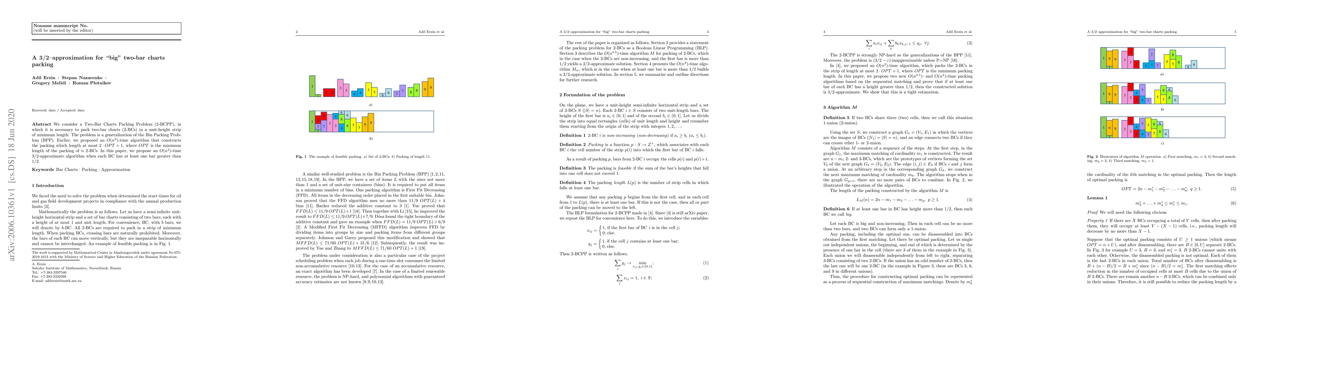 Summary: This paper presents a 3/2-approximation algorithm for the Two-Bar Charts Packing Problem (2-BCPP) that aims to pack two-bar charts in a unit-height strip of minimum length. The proposed $O(n^4)$-time algorithm improves upon a previous $O(n^2)$ solution, achieving a packing length at most $2 \cdot OPT+1$, with each bar chart having at least one bar greater than 1/2.