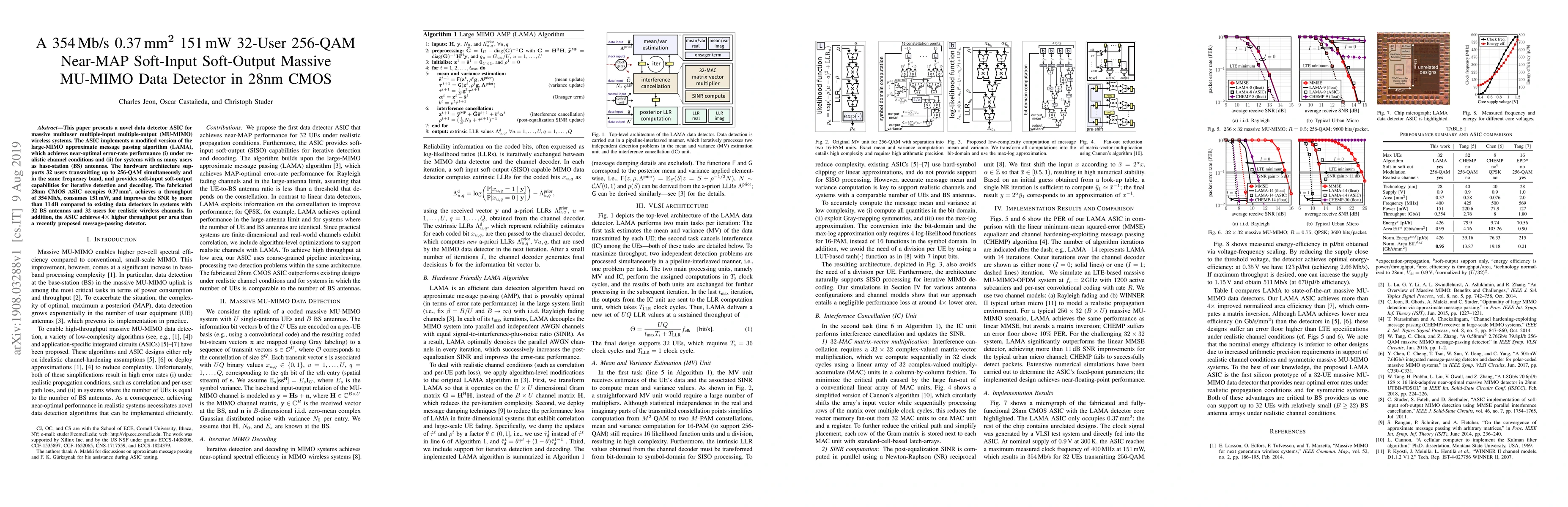 This paper introduces a novel ASIC for massive MU-MIMO systems implementing a modified LAMA algorithm, achieving near-optimal performance and supporting 32 users with 256-QAM in 28nm CMOS, with a throughput of 354Mb/s and power consumption of 151mW. The design significantly improves SNR and throughput per area compared to existing detectors.