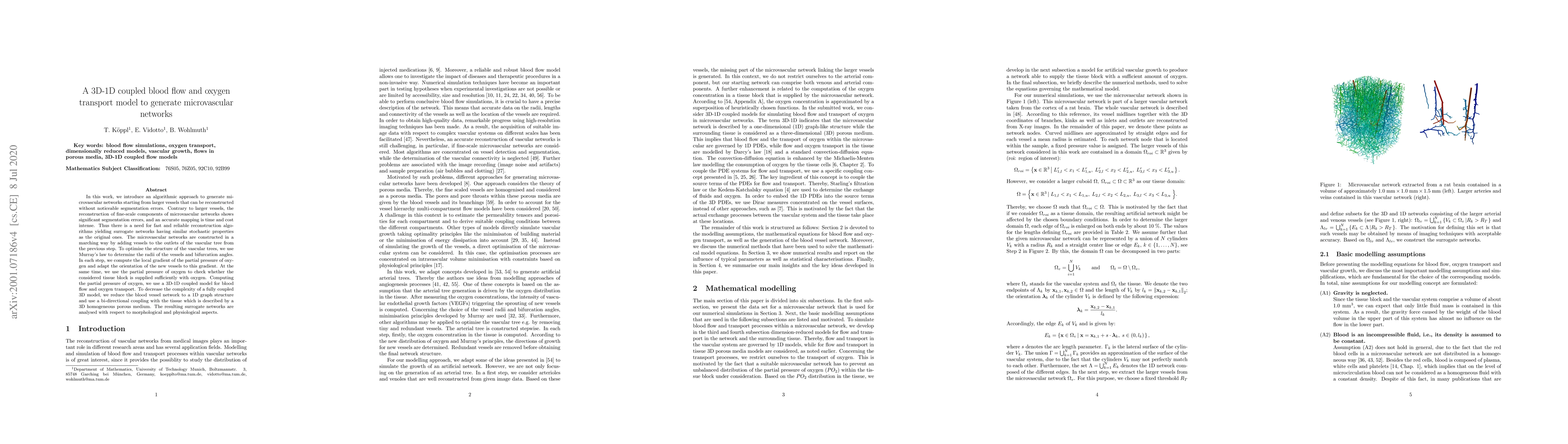 In this work, we introduce an algorithmic approach to generate microvascular networks starting from larger vessels that can be reconstructed without noticeable segmentation errors. Contrary to larger vessels, the reconstruction of fine-scale components of microvascular networks shows significant segmentation errors, and an accurate mapping is time and cost intense. Thus there is a need for fast and reliable reconstruction algorithms yielding surrogate networks having similar stochastic properties as the original ones. The microvascular networks are constructed in a marching way by adding vessels to the outlets of the vascular tree from the previous step. To optimise the structure of the vascular trees, we use Murray's law to determine the radii of the vessels and bifurcation angles. In each step, we compute the local gradient of the partial pressure of oxygen and adapt the orientation of the new vessels to this gradient. At the same time, we use the partial pressure of oxygen to check whether the considered tissue block is supplied sufficiently with oxygen. Computing the partial pressure of oxygen, we use a 3D-1D coupled model for blood flow and oxygen transport. To decrease the complexity of a fully coupled 3D model, we reduce the blood vessel network to a 1D graph structure and use a bi-directional coupling with the tissue which is described by a 3D homogeneous porous medium. The resulting surrogate networks are analysed with respect to morphological and physiological aspects.