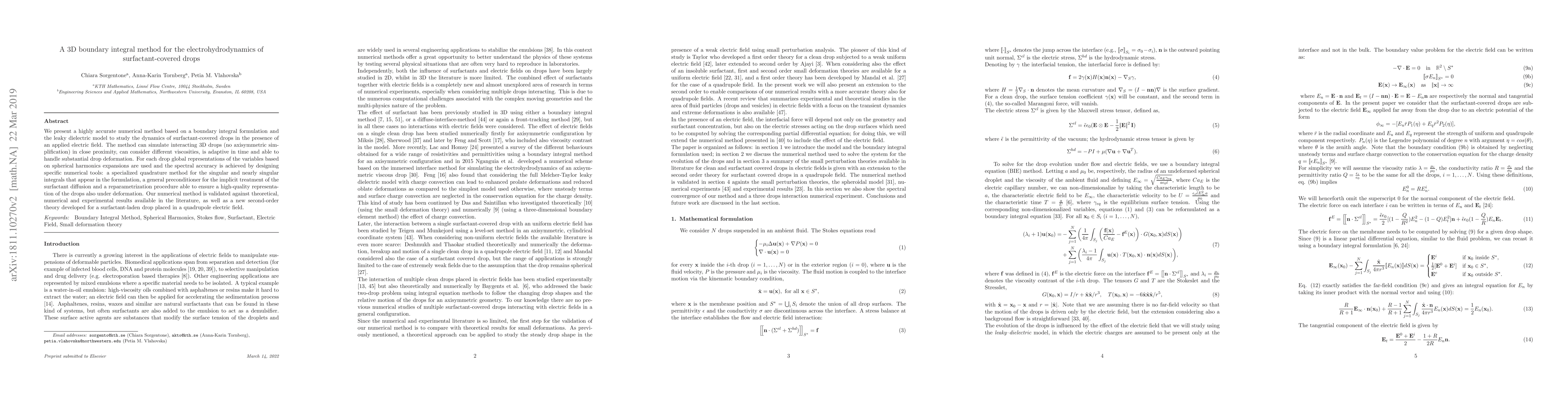 This paper introduces a 3D boundary integral method for simulating the electrohydrodynamics of surfactant-covered drops under electric fields, employing a leaky dielectric model and achieving high accuracy through adaptive time-stepping and spectral methods. The method validates against existing theories and experiments, demonstrating its capability to handle complex drop interactions and deformations.