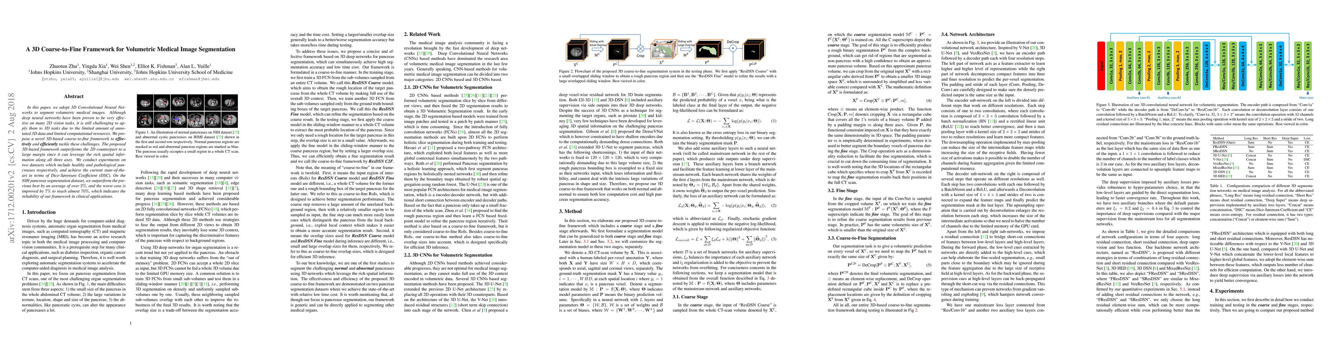 This paper proposes a 3D coarse-to-fine framework using 3D Convolutional Neural Networks for volumetric medical image segmentation, achieving state-of-the-art results on pancreas datasets by leveraging spatial information across three axes. The method outperforms previous 2D approaches and shows significant improvements in Dice-Sørensen Coefficient.