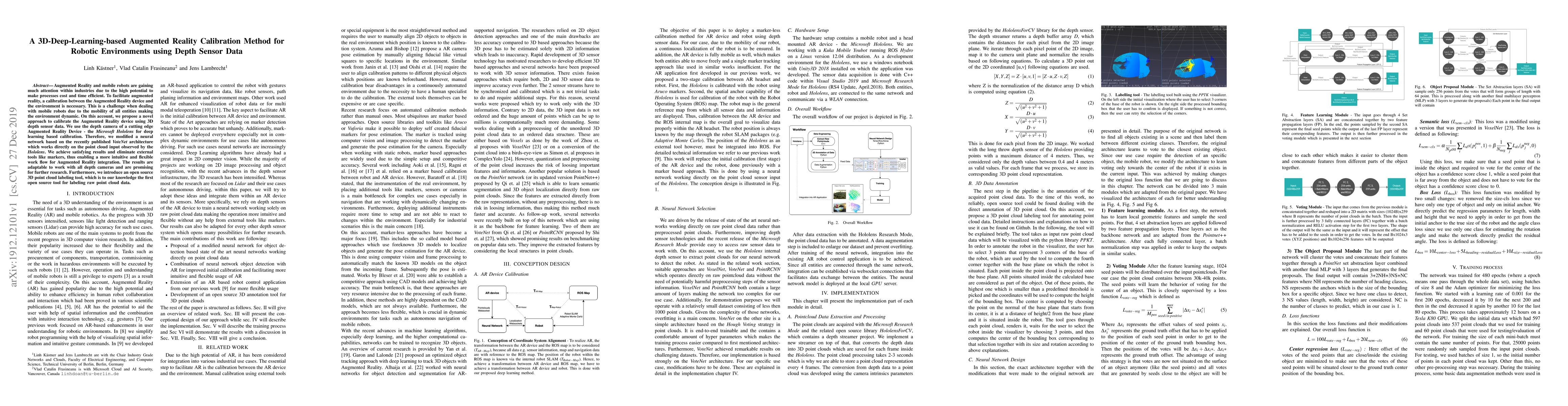 Augmented Reality and mobile robots are gaining much attention within industries due to the high potential to make processes cost and time efficient. To facilitate augmented reality, a calibration between the Augmented Reality device and the environment is necessary. This is a challenge when dealing with mobile robots due to the mobility of all entities making the environment dynamic. On this account, we propose a novel approach to calibrate the Augmented Reality device using 3D depth sensor data. We use the depth camera of a cutting edge Augmented Reality Device - the Microsoft Hololens for deep learning based calibration. Therefore, we modified a neural network based on the recently published VoteNet architecture which works directly on the point cloud input observed by the Hololens. We achieve satisfying results and eliminate external tools like markers, thus enabling a more intuitive and flexible work flow for Augmented Reality integration. The results are adaptable to work with all depth cameras and are promising for further research. Furthermore, we introduce an open source 3D point cloud labeling tool, which is to our knowledge the first open source tool for labeling raw point cloud data.