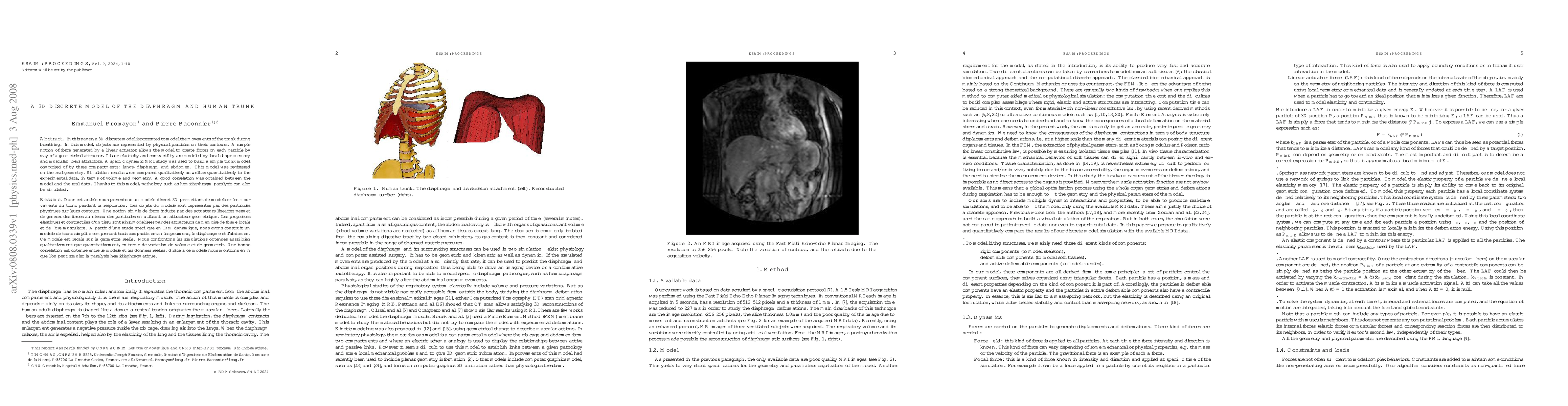 A 3D discrete model simulates human trunk movements during breathing with high accuracy, allowing for the study of conditions like hemidiaphragm paralysis. The model uses geometric attractors to represent tissue elasticity and contractility.