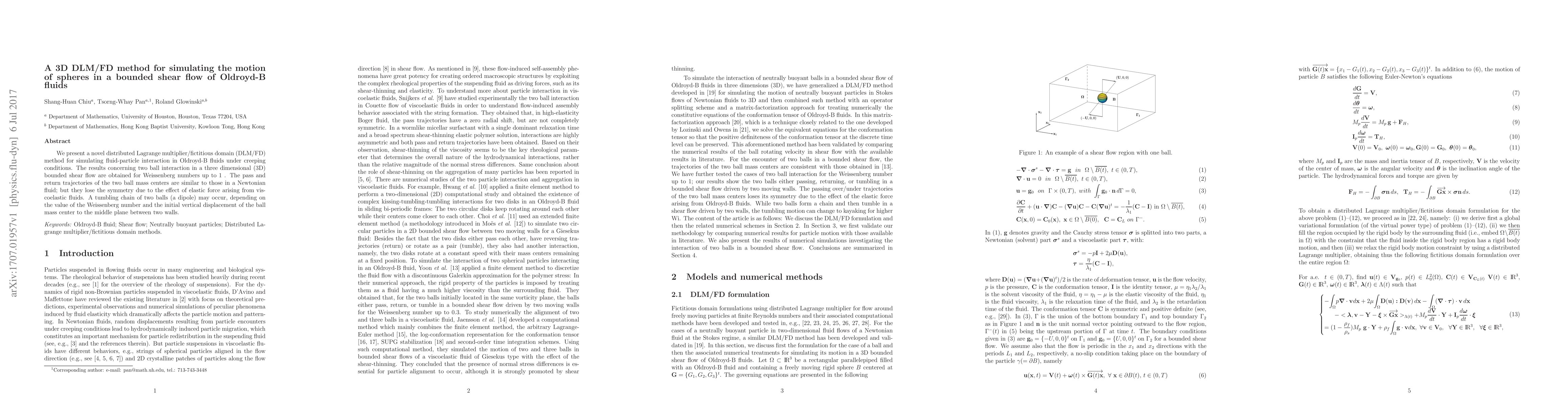 This paper introduces a new DLM/FD method for simulating the motion of spheres in shear flows of Oldroyd-B fluids. The study reveals that while trajectories of two spheres resemble those in Newtonian fluids, viscoelastic effects cause asymmetry and can lead to a tumbling chain formation.