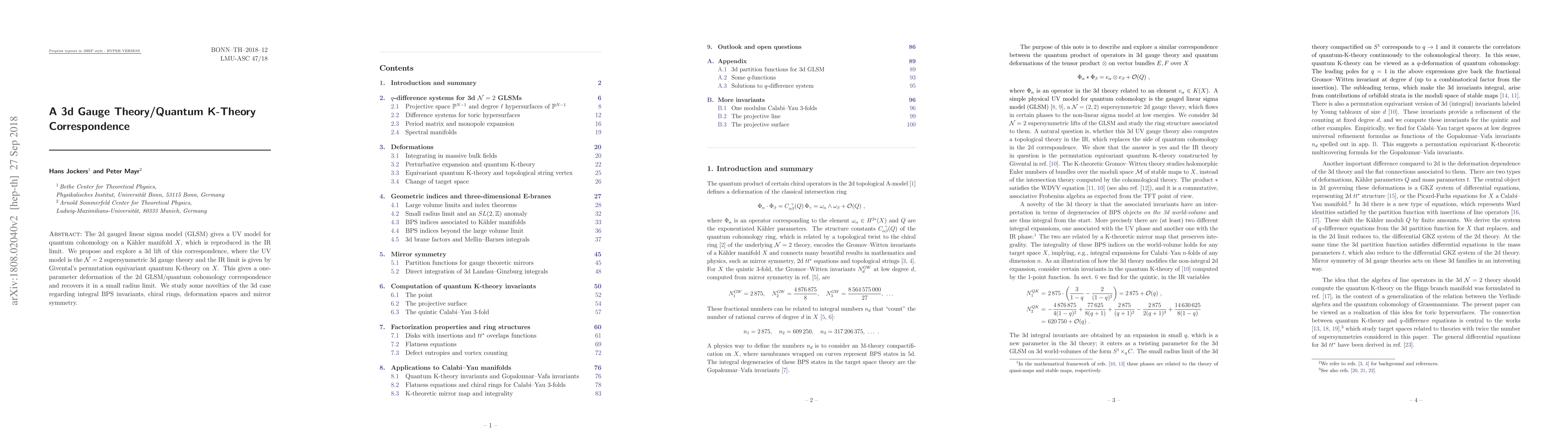 The 2d gauged linear sigma model (GLSM) gives a UV model for quantum cohomology on a Kahler manifold X, which is reproduced in the IR limit. We propose and explore a 3d lift of this correspondence, where the UV model is the N=2 supersymmetric 3d gauge theory and the IR limit is given by Givental's permutation equivariant quantum K-theory on X. This gives a one-parameter deformation of the 2d GLSM/quantum cohomology correspondence and recovers it in a small radius limit. We study some novelties of the 3d case regarding integral BPS invariants, chiral rings, deformation spaces and mirror symmetry.