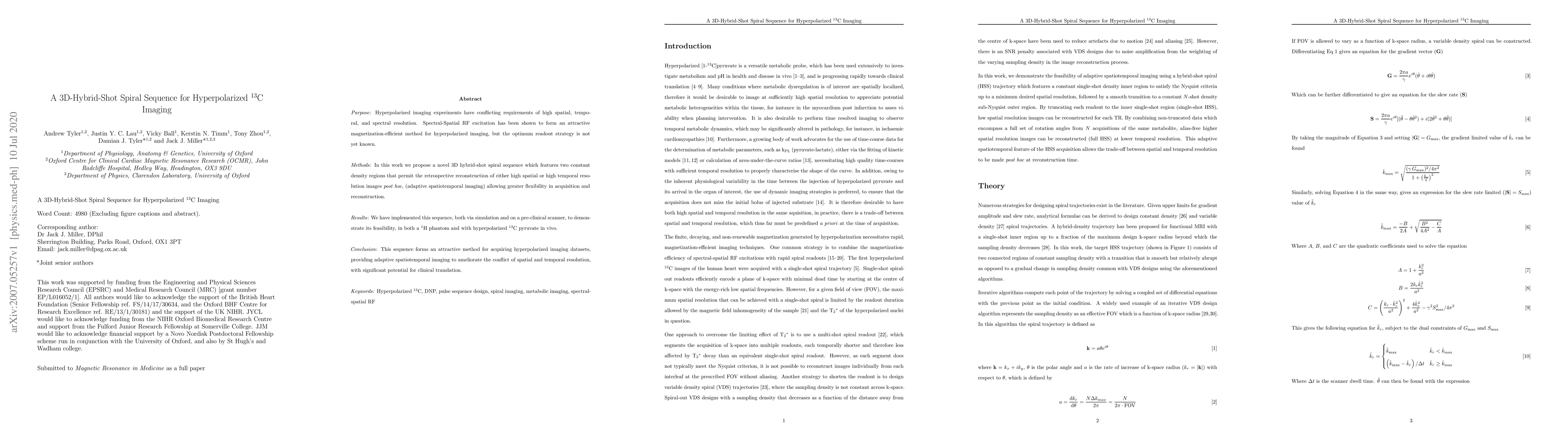 Purpose: Hyperpolarized imaging experiments have conflicting requirements of high spatial, temporal, and spectral resolution. Spectral-Spatial RF excitation has been shown to form an attractive magnetization-efficient method for hyperpolarized imaging, but the optimum readout strategy is not yet known. Methods: In this work we propose a novel 3D hybrid-shot spiral sequence which features two constant density regions that permit the retrospective reconstruction of either high spatial or high temporal resolution images post hoc, (adaptive spatiotemporal imaging) allowing greater flexibility in acquisition and reconstruction. Results: We have implemented this sequence, both via simulation and on a pre-clinical scanner, to demonstrate its feasibility, in both a 1H phantom and with hyperpolarized 13C pyruvate in vivo. Conclusion: This sequence forms an attractive method for acquiring hyperpolarized imaging datasets, providing adaptive spatiotemporal imaging to ameliorate the conflict of spatial and temporal resolution, with significant potential for clinical translation.