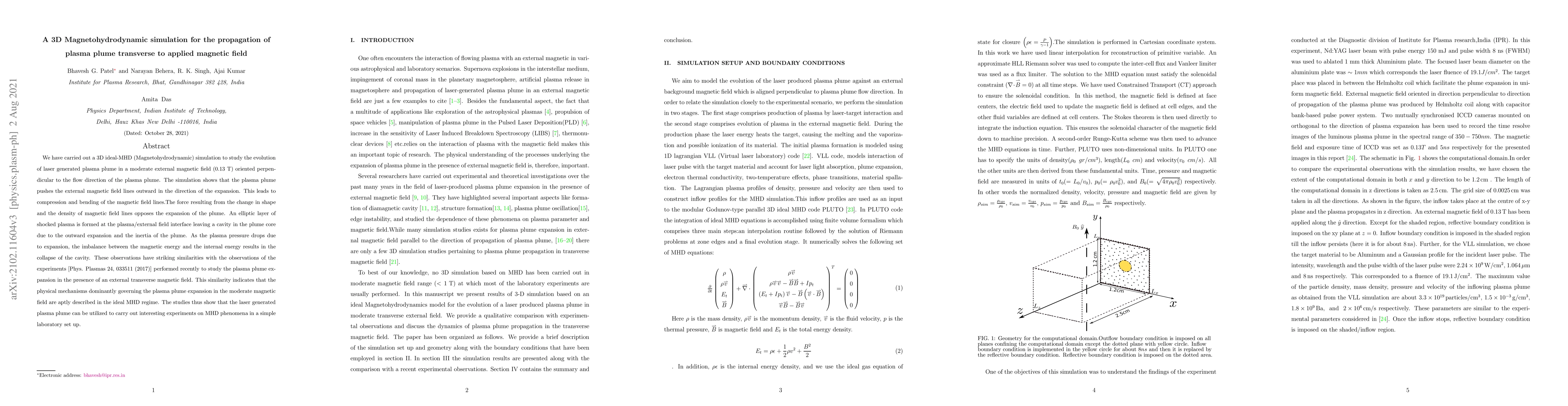 This paper presents a 3D ideal-MHD simulation of laser-generated plasma plume expansion against a transverse magnetic field, revealing the formation of an elliptic layer and a cavity due to magnetic field compression and bending. The study aligns with experimental observations, indicating the potential for laboratory experiments on magnetohydrodynamic phenomena.