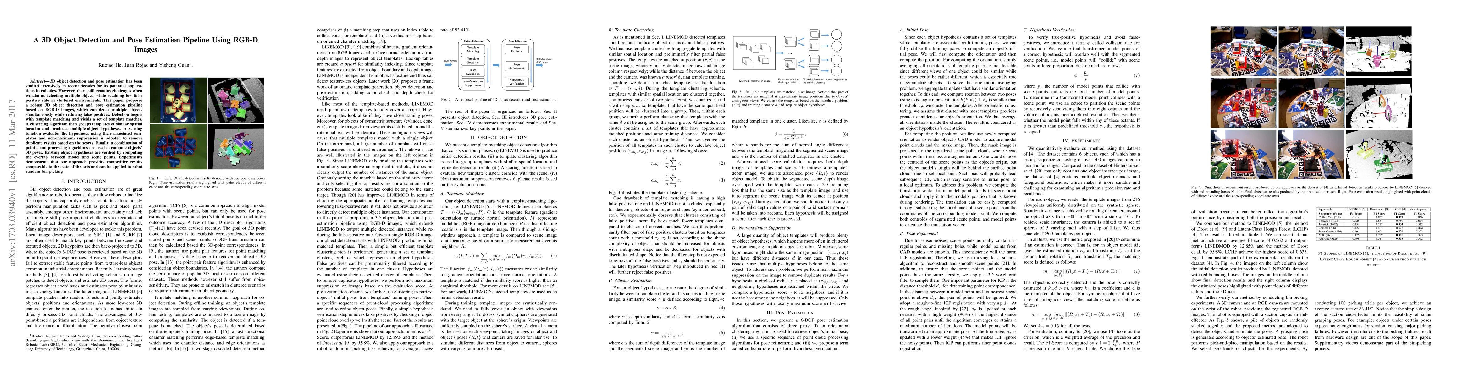 This paper proposes a robust 3D object detection and pose estimation pipeline using RGB-D images, effectively detecting multiple objects in cluttered environments while minimizing false positives. The method combines template matching, clustering, scoring, and point cloud processing to achieve accurate results.