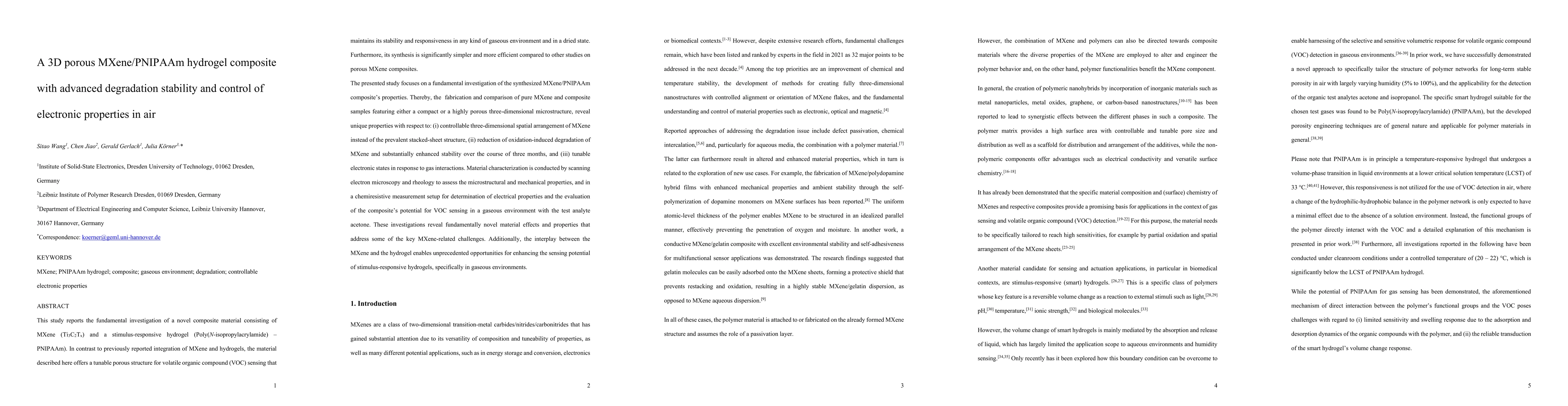 This study reports the fundamental investigation of a novel composite material consisting of MXene (Ti$_3$C$_2$T$_x$) and a stimulus-responsive hydrogel (Poly(N-isopropylacrylamide) - PNIPAAm). In contrast to previously reported integration of MXene and hydrogels, the material described here offers a tunable porous structure for volatile organic compound (VOC) sensing that maintains its stability and responsiveness in any kind of gaseous environment and in a dried state. Furthermore, its synthesis is significantly simpler and more efficient compared to other studies on porous MXene composites. The presented study focuses on a fundamental investigation of the synthesized MXene/PNIPAAm composite's properties. Thereby, the fabrication and comparison of pure MXene and composite samples featuring either a compact or a highly porous three-dimensional microstructure, reveal unique properties with respect to: (i) controllable three-dimensional spatial arrangement of MXene instead of the prevalent stacked-sheet structure, (ii) reduction of oxidation-induced degradation of MXene and substantially enhanced stability over the course of three months, and (iii) tunable electronic states in response to gas interactions. Material characterization is conducted by scanning electron microscopy and rheology to assess the microstructural and mechanical properties, and in a chemiresistive measurement setup for determination of electrical properties and the evaluation of the composite's potential for VOC sensing in a gaseous environment with the test analyte acetone. These investigations reveal fundamentally novel material effects and properties that address some of the key MXene-related challenges. Additionally, the interplay between the MXene and the hydrogel enables unprecedented opportunities for enhancing the sensing potential of stimulus-responsive hydrogels, specifically in gaseous environments.