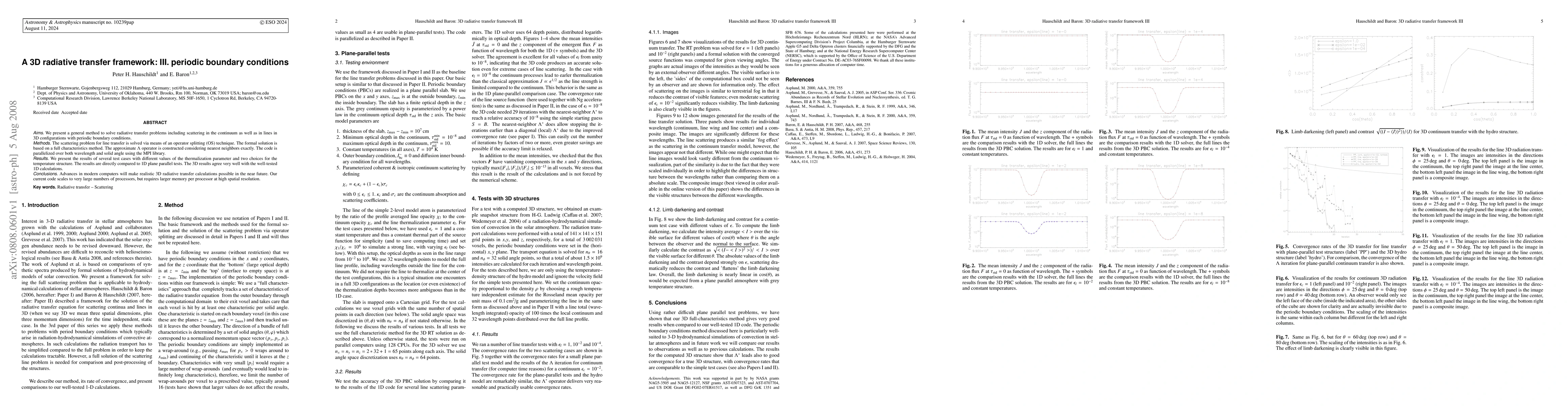 This paper introduces a 3D radiative transfer framework with periodic boundary conditions, employing an operator splitting technique for solving scattering problems. The method is parallelized and validated through test cases, showing good agreement with 1D plane parallel calculations.