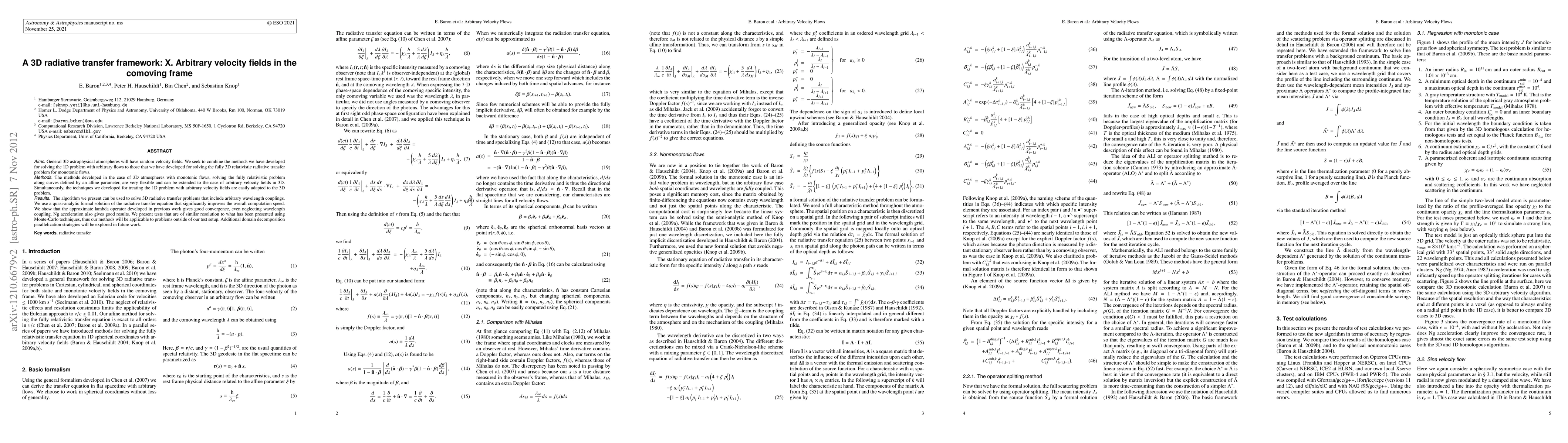 3-D astrophysical atmospheres will have random velocity fields. We seek to combine the methods we have developed for solving the 1-D problem with arbitrary flows to those that we have developed for solving the fully 3-D relativistic radiative transfer problem in the case of monotonic flows. The methods developed in the case of 3-D atmospheres with monotonic flows, solving the fully relativistic problem along curves defined by an affine parameter, are very flexible and can be extended to the case of arbitrary velocity fields in 3-D. Simultaneously, the techniques we developed for treating the 1-D problem with arbitrary velocity fields are easily adapted to the 3-D problem. The algorithm we present allows the solution of 3-D radiative transfer problems that include arbitrary wavelength couplings. We use a quasi-analytic formal solution of the radiative transfer equation that significantly improves the overall computation speed. We show that the approximate lambda operator developed in previous work gives good convergence, even neglecting wavelength coupling. Ng acceleration also gives good results. We present tests that are of similar resolution to what has been presented using Monte-Carlo techniques, thus our methods will be applicable to problems outside of our test setup. Additional domain decomposition parallelization strategies will be explored in future work.