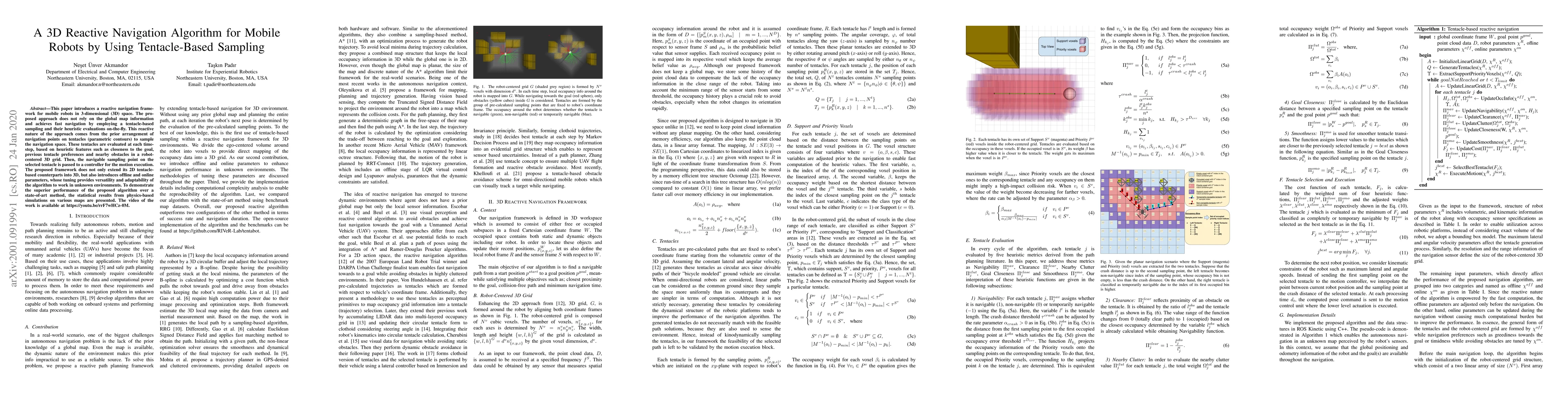 This paper proposes a 3D reactive navigation algorithm for mobile robots using tentacle-based sampling, enabling fast navigation without global map information. The algorithm evaluates tentacle-based parametric contours in real-time based on heuristics, demonstrating superior performance over state-of-the-art methods in simulations.