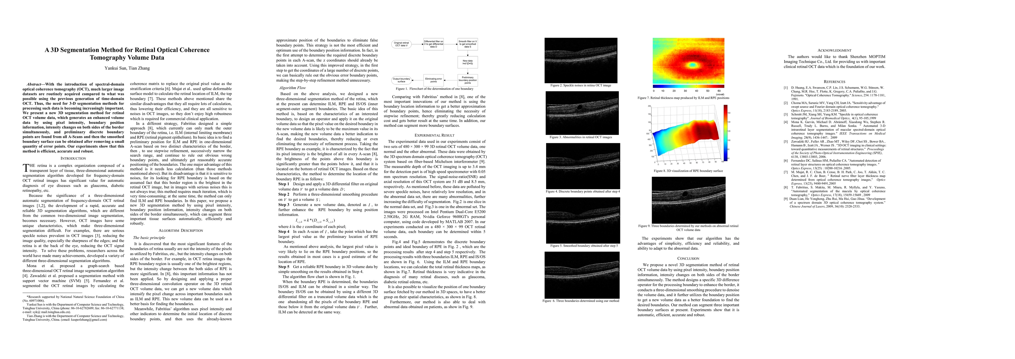 This paper introduces a novel 3D segmentation method for processing retinal optical coherence tomography (OCT) volume data, utilizing pixel intensity, boundary information, and intensity changes to generate enhanced volume data. The method is shown to be efficient, accurate, and robust in experiments.