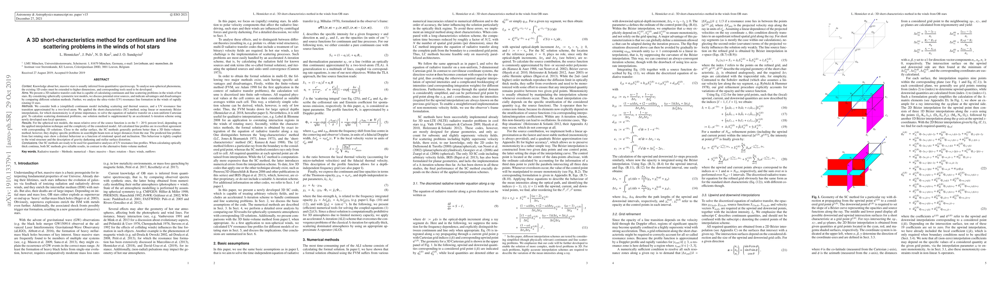 Context: Knowledge about hot, massive stars is usually inferred from quantitative spectroscopy. To analyse non-spherical phenomena, the existing 1D codes must be extended to higher dimensions, and corresponding tools need to be developed. Aims: We present a 3D radiative transfer code that is capable of calculating continuum and line scattering problems in the winds of hot stars. By considering spherically symmetric test models, we discuss potential error sources, and indicate advantages and disadvantages by comparing different solution methods. Further, we analyse the UV resonance line formation in the winds of rapidly rotating O stars. Methods: We consider both a (simplified) continuum model including scattering and thermal sources, and a UV resonance line transition approximated by a two-level-atom. We applied the short-characteristics (SC) method, using linear or monotonic B\'ezier interpolations, to solve the equation of radiative transfer on a non-uniform Cartesian grid. To calculate scattering dominated problems, our solution method is supplemented by an accelerated $\Lambda$-iteration scheme. Results: For the spherical test models, the mean relative error of the source function is on the $5-20\,\%$ level, depending on the applied interpolation technique and the complexity of the considered model. All calculated line profiles are in excellent agreement with corresponding 1D solutions. The predicted line profiles from fast rotating stars show a distinct behaviour as a function of rotational speed and inclination. This behaviour is tightly coupled to the wind structure and the description of gravity darkening and stellar surface distortion. Conclusions: Our SC methods are ready to be used for quantitative analyses of UV resonance line profiles. When calculating optically thick continua, both SC methods give reliable results, in contrast to the alternative finite-volume method.