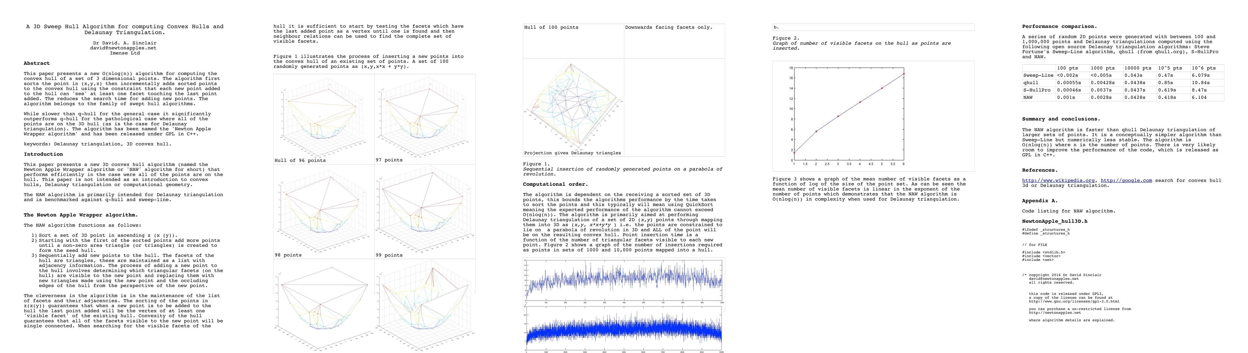 This paper presents a new O(nlog(n)) algorithm for computing the convex hull of a set of 3 dimensional points. The algorithm first sorts the point in (x,y,z) then incrementally adds sorted points to the convex hull using the constraint that each new point added to the hull can 'see' at least one facet touching the last point added. The reduces the search time for adding new points. The algorithm belongs to the family of swept hull algorithms. While slower than q-hull for the general case it significantly outperforms q-hull for the pathological case where all of the points are on the 3D hull (as is the case for Delaunay triangulation). The algorithm has been named the 'Newton Apple Wrapper algorithm' and has been released under GPL in C++. keywords: Delaunay triangulation, 3D convex hull.