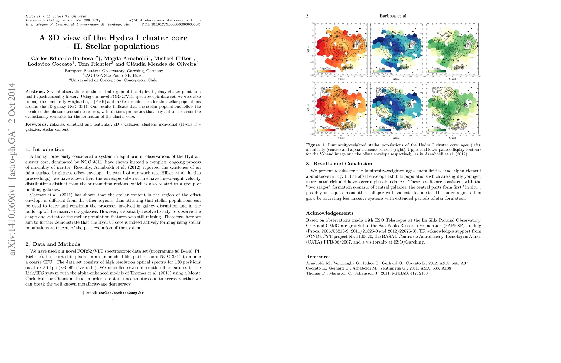 Several observations of the central region of the Hydra I galaxy cluster point to a multi-epoch assembly history. Using our novel FORS2/VLT spectroscopic data set, we were able to map the luminosity-weighted age, [Fe/H] and [$\alpha$/Fe] distributions for the stellar populations around the cD galaxy NGC 3311. Our results indicate that the stellar populations follow the trends of the photometric substructures, with distinct properties that may aid to constrain the evolutionary scenarios for the formation of the cluster core.