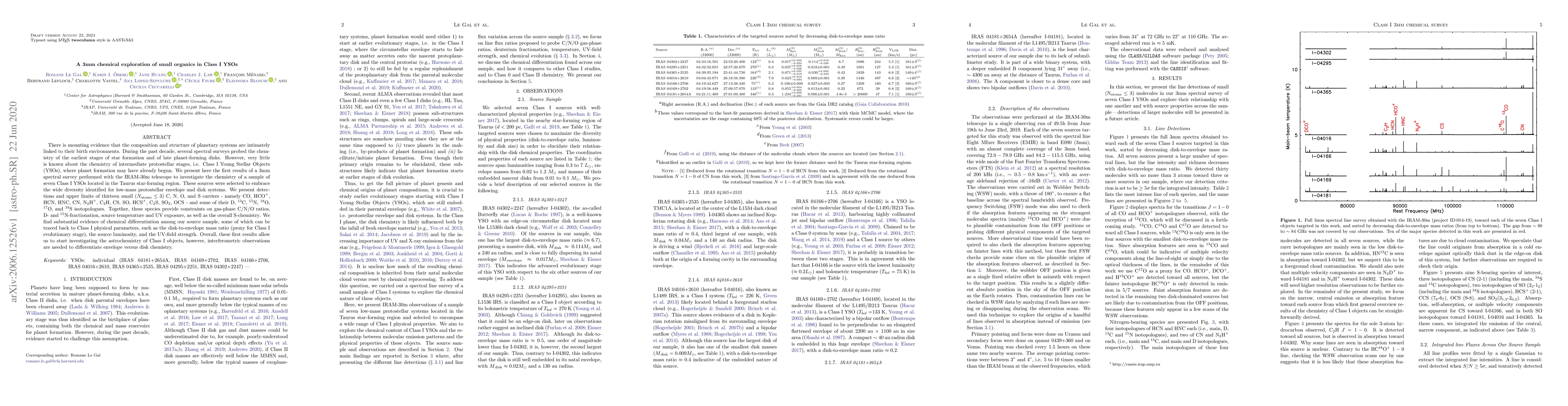 There is mounting evidence that the composition and structure of planetary systems are intimately linked to their birth environments. During the past decade, several spectral surveys probed the chemistry of the earliest stages of star formation and of late planet-forming disks. However, very little is known about the chemistry of intermediate protostellar stages, i.e. Class I Young Stellar Objects (YSOs), where planet formation may have already begun. We present here the first results of a 3mm spectral survey performed with the IRAM-30m telescope to investigate the chemistry of a sample of seven Class I YSOs located in the Taurus star-forming region. These sources were selected to embrace the wide diversity identified for low-mass protostellar envelope and disk systems. We present detections and upper limits of thirteen small ($N_{\rm atoms}\leq3$) C, N, O, and S carriers - namely CO, HCO$^+$, HCN, HNC, CN, N$_2$H$^+$, C$_2$H, CS, SO, HCS$^+$, C$_2$S, SO$_2$, OCS - and some of their D, $^{13}$C, $^{15}$N, $^{18}$O, $^{17}$O, and $^{34}$S isotopologues. Together, these species provide constraints on gas-phase C/N/O ratios, D- and $^{15}$N-fractionation, source temperature and UV exposure, as well as the overall S-chemistry. We find substantial evidence of chemical differentiation among our source sample, some of which can be traced back to Class I physical parameters, such as the disk-to-envelope mass ratio (proxy for Class I evolutionary stage), the source luminosity, and the UV-field strength. Overall, these first results allow us to start investigating the astrochemistry of Class I objects, however, interferometric observations are needed to differentiate envelope versus disk chemistry.