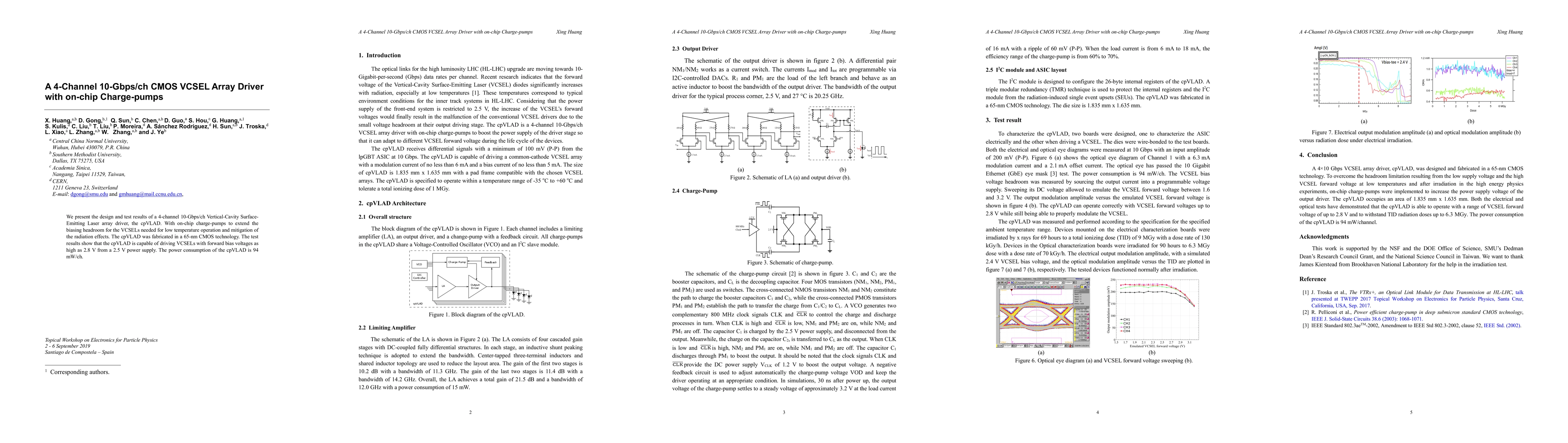 This paper details a 4-channel 10-Gbps/ch CMOS VCSEL array driver with on-chip charge-pumps, demonstrating its capability to operate VCSELs at high forward bias voltages from a 2.5 V power supply, achieving a power consumption of 94 mW per channel.