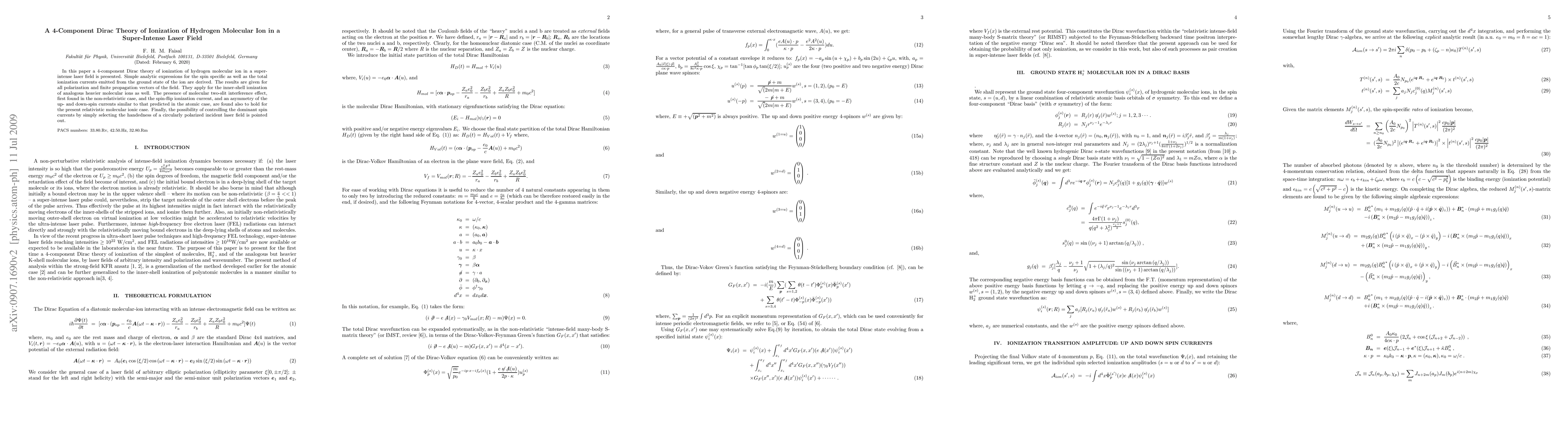 This paper develops a 4-component Dirac theory to analyze the ionization of hydrogen molecular ions in super-intense laser fields, deriving analytic expressions for spin-specific and total ionization currents. It highlights the presence of molecular two-slit interference and spin-flip effects, and suggests controlling spin currents via the laser field's handedness.