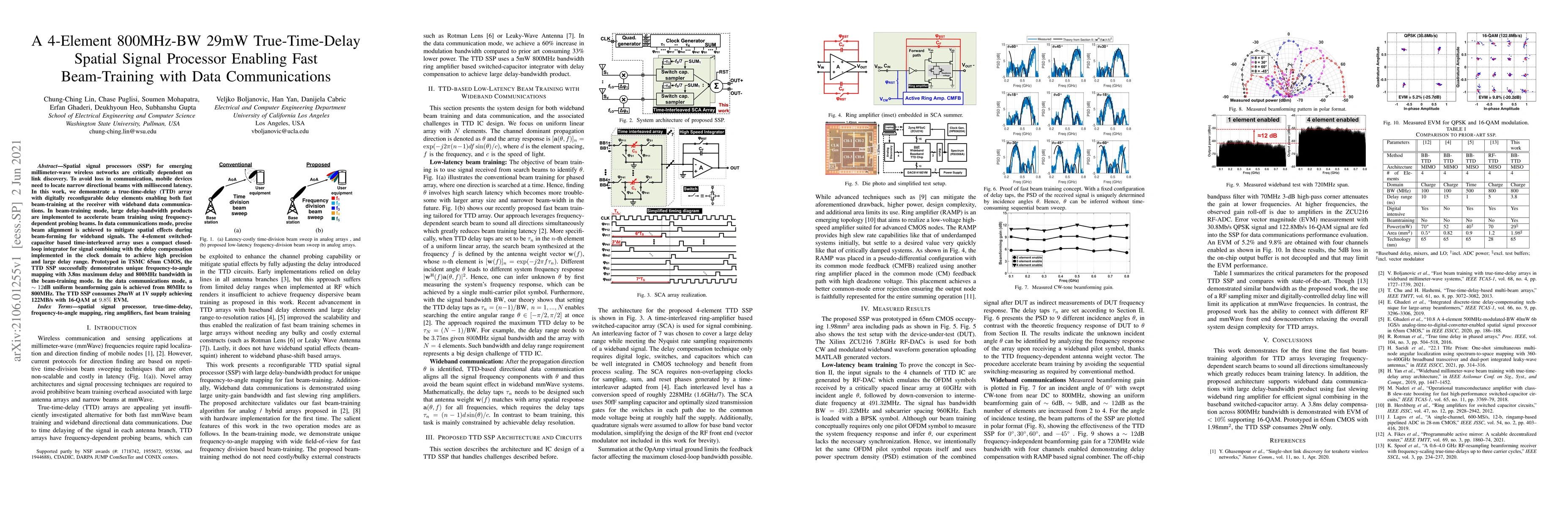 This paper presents a 4-element true-time-delay spatial signal processor for millimeter-wave wireless networks, enabling fast beam-training and wideband data communications. The processor achieves high precision and large delay range, demonstrating 3.8ns delay with 800MHz bandwidth and 12dB gain across 80MHz to 800MHz frequencies.