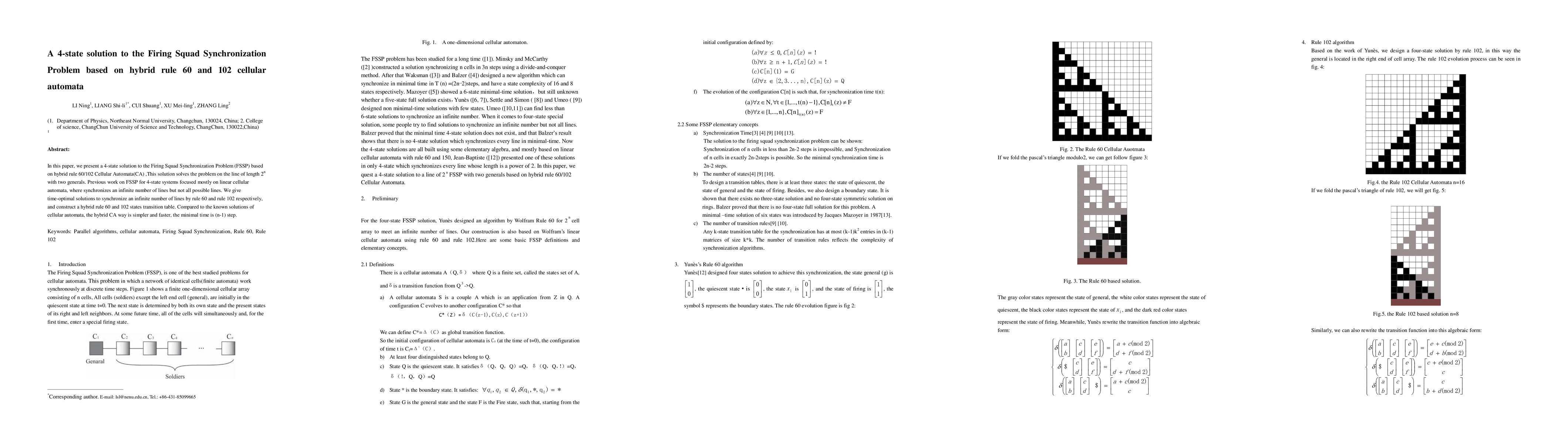 In this paper, we present a 4-state solution to the Firing Squad Synchronization Problem (FSSP) based on hybrid rule 60/102 Cellular Automata(CA). This solution solves the problem on the line of length 2^n with two generals. Previous work on FSSP for 4-state systems focused mostly on linear cellular automata, where synchronizes an infinite number of lines but not all possible lines. We give time-optimal solutions to synchronize an infinite number of lines by rule 60 and rule 102 respectively, and construct a hybrid rule 60 and 102 states transition table. Compared to the known solutions of cellular automata, the hybrid CA way is simpler and faster, the minimal time is (n-1) step.