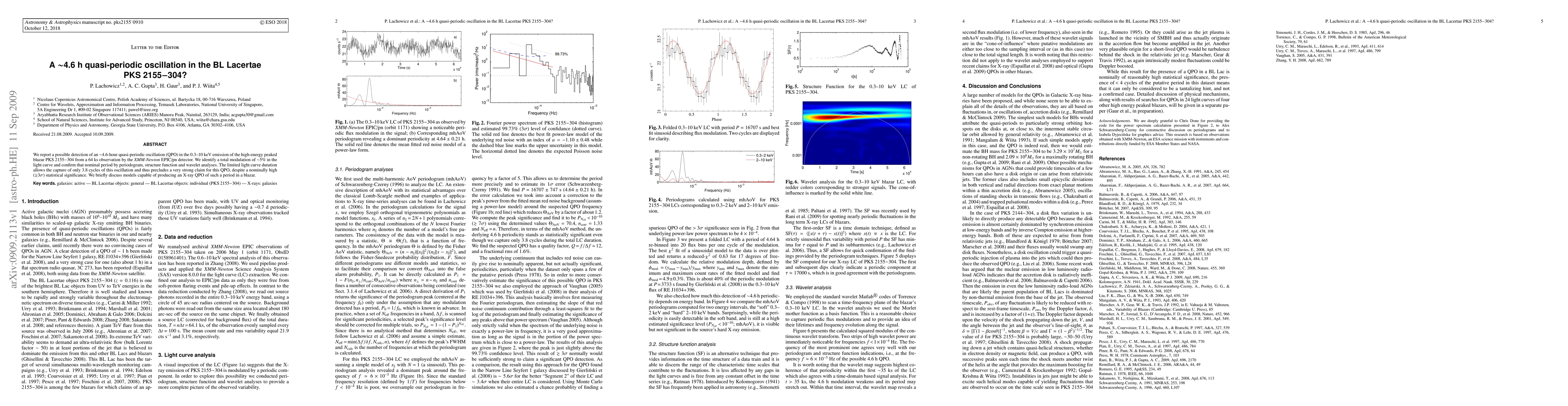 Researchers detected a possible 4.6-hour quasi-periodic oscillation in the X-ray emission of blazar PKS 2155-304 with high statistical significance but limited light curve duration.