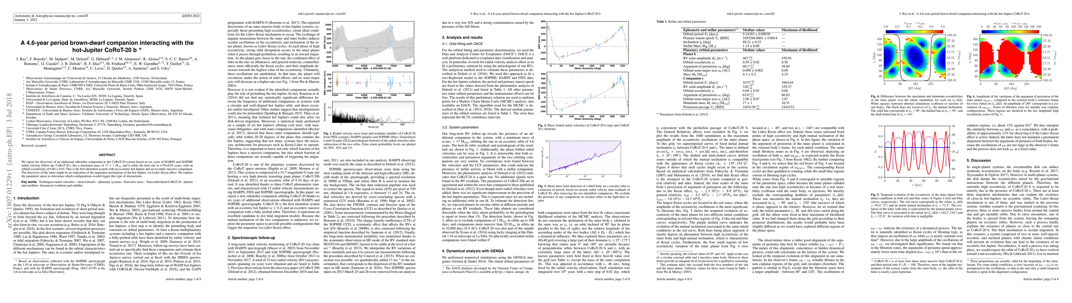 A new brown-dwarf companion, CoRoT-20 c, was discovered in the CoRoT-20 system, orbiting with a period of 4.59 years and an eccentricity of 0.60. This makes it the first system with an eccentric hot Jupiter and massive companion, suggesting migration via Lidov-Kozai effect.