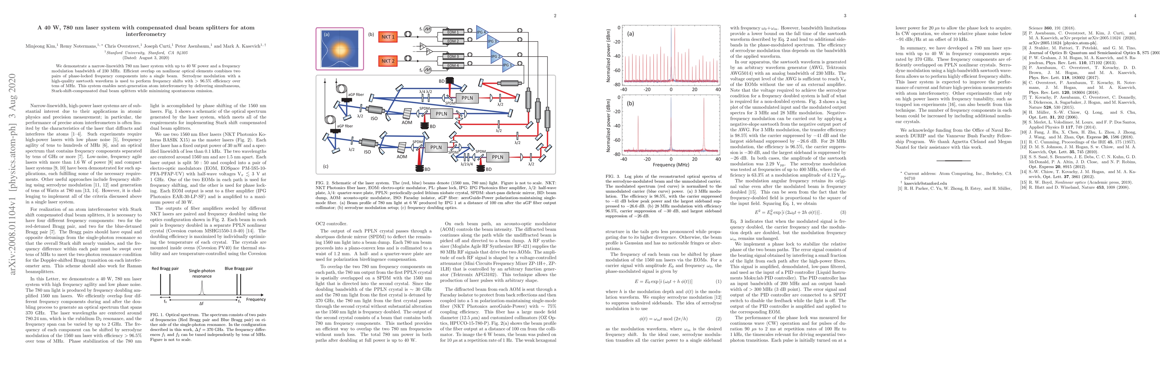 This paper presents a high-power, narrow-linewidth 780 nm laser system capable of delivering up to 40 W, enabling efficient atom interferometry through compensated dual beam splitters and minimizing spontaneous emission. The system utilizes serrodyne modulation for high-efficiency frequency shifts.