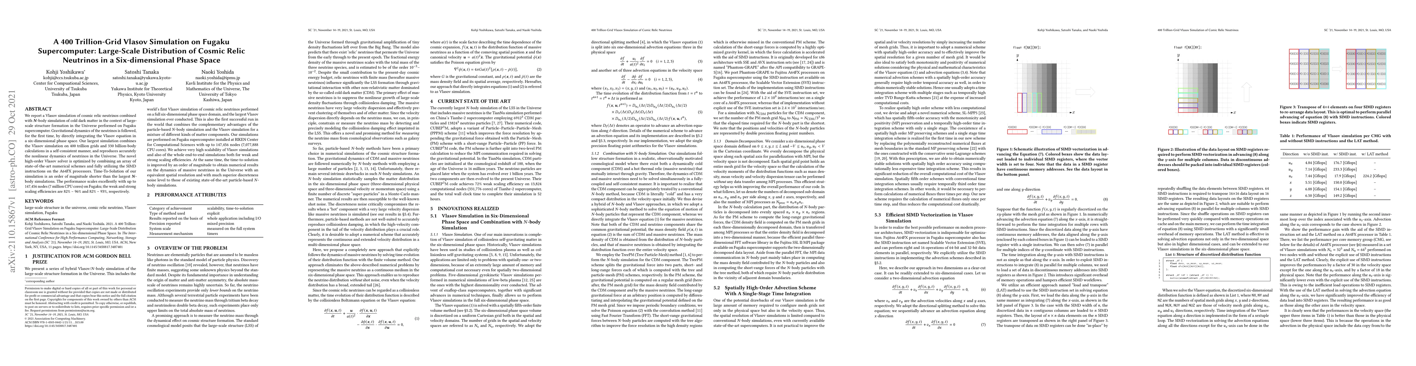 We report a Vlasov simulation of cosmic relic neutrinos combined with N-body simulation of cold dark matter in the context of large-scale structure formation in the Universe performed on Fugaku supercomputer. Gravitational dynamics of the neutrinos is followed, for the first time, by directly integrating the Vlasov equation in a six-dimensional phase space. Our largest simulation combines the Vlasov simulation on 400 trillion grids and 330 billion-body calculations in a self-consistent manner, and reproduces accurately the nonlinear dynamics of neutrinos in the Universe. The novel high-order Vlasov solver is optimized by combining an array of state-of-the-art numerical schemes and fully utilizing the SIMD instructions on the A64FX processors. Time-To-Solution of our simulation is an order of magnitude shorter than the largest N-body simulations. The performance scales excellently with up to 147,456 nodes (7 million CPU cores) on Fugaku; the weak and strong scaling efficiencies are 82% - 96% and 82% - 93%, respectively.