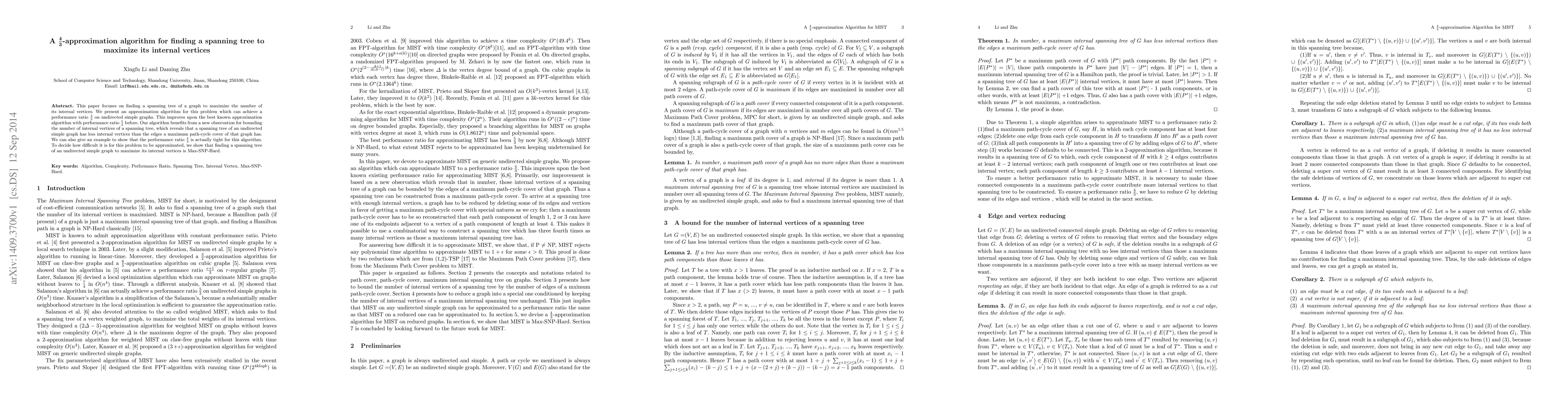 This paper presents a 4/3-approximation algorithm for maximizing internal vertices in a spanning tree of undirected simple graphs, improving upon previous algorithms. The algorithm's effectiveness is demonstrated through a new observation about internal vertices and edge counts in spanning trees.