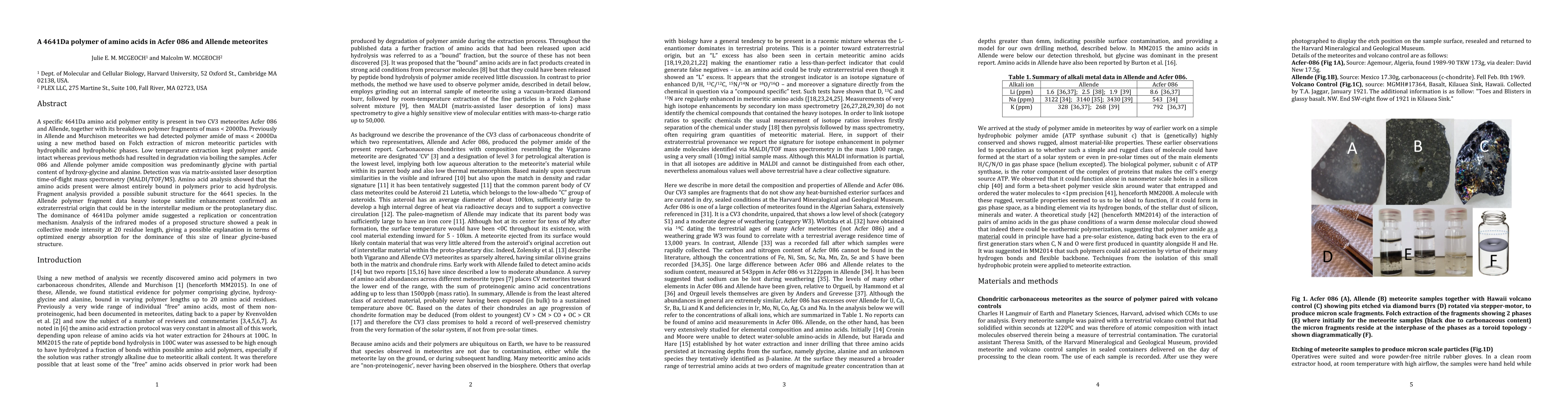 This study identifies a 4641Da amino acid polymer in the Acfer 086 and Allende meteorites, primarily composed of glycine, hydroxy-glycine, and alanine, detected using MALDI/TOF/MS. The polymer's extraterrestrial origin is supported by heavy isotope satellite enhancement and its dominance suggests a replication or concentration mechanism in the interstellar medium or protoplanetary disc.