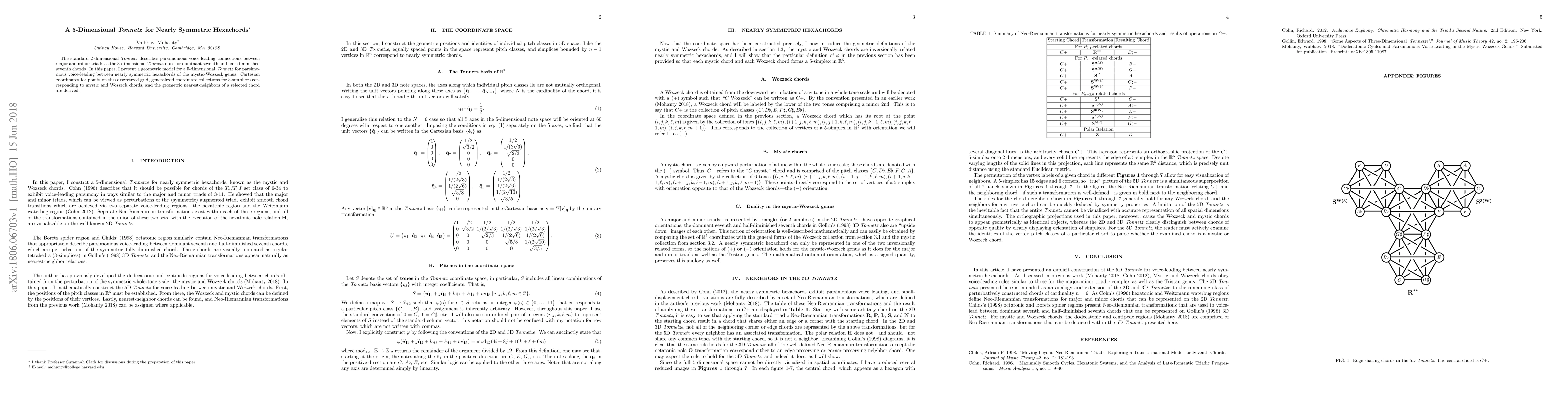 A new 5-dimensional Tonnetz model is proposed for parsimonious voice-leading between nearly symmetric hexachords, extending the existing 2D and 3D models to a higher dimension.