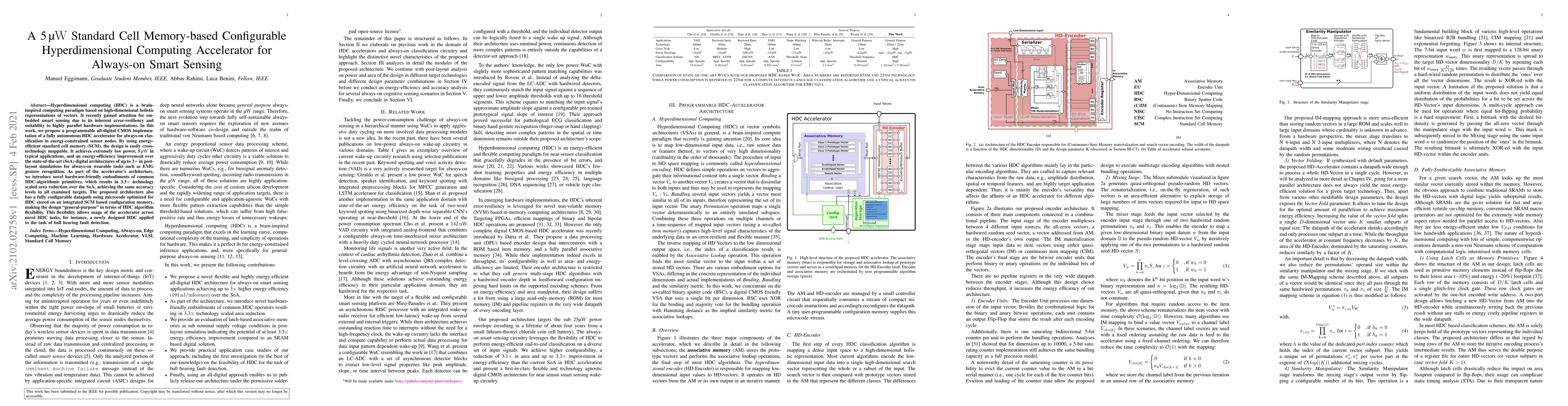This paper proposes a low-power, 5 μW CMOS-based hyperdimensional computing accelerator for always-on smart sensing, achieving up to 3× energy efficiency over state-of-the-art digital architectures. The design features novel algorithmic primitives and a configurable datapath for versatile HDC applications.