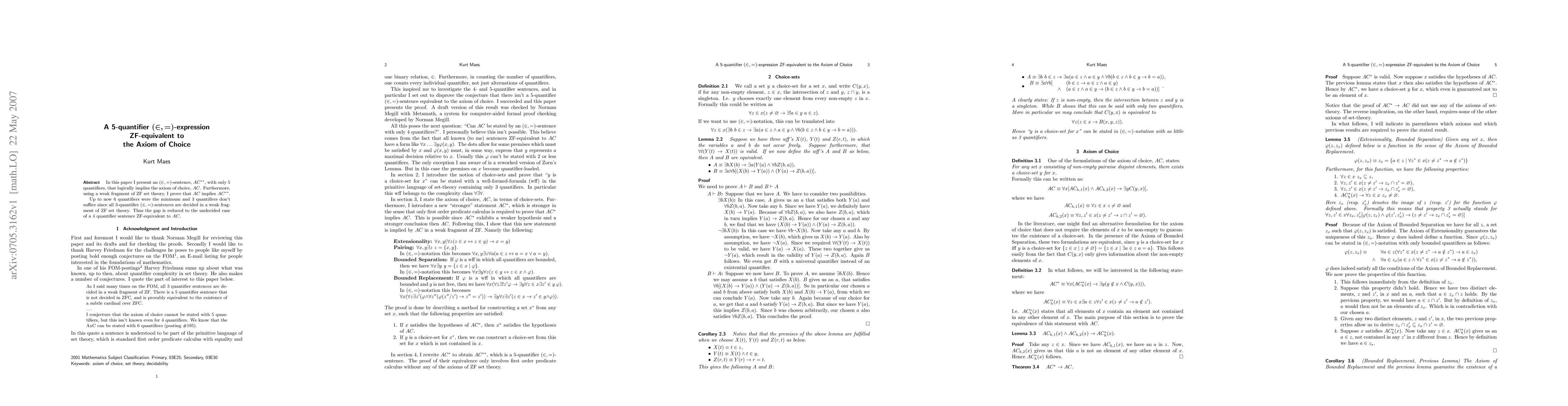 This paper introduces a 5-quantifier (\in, =)-expression, AC**, which logically implies the Axiom of Choice (AC). It also proves that AC implies AC**, reducing the minimum number of quantifiers previously needed to 5, down from the previously established 6.