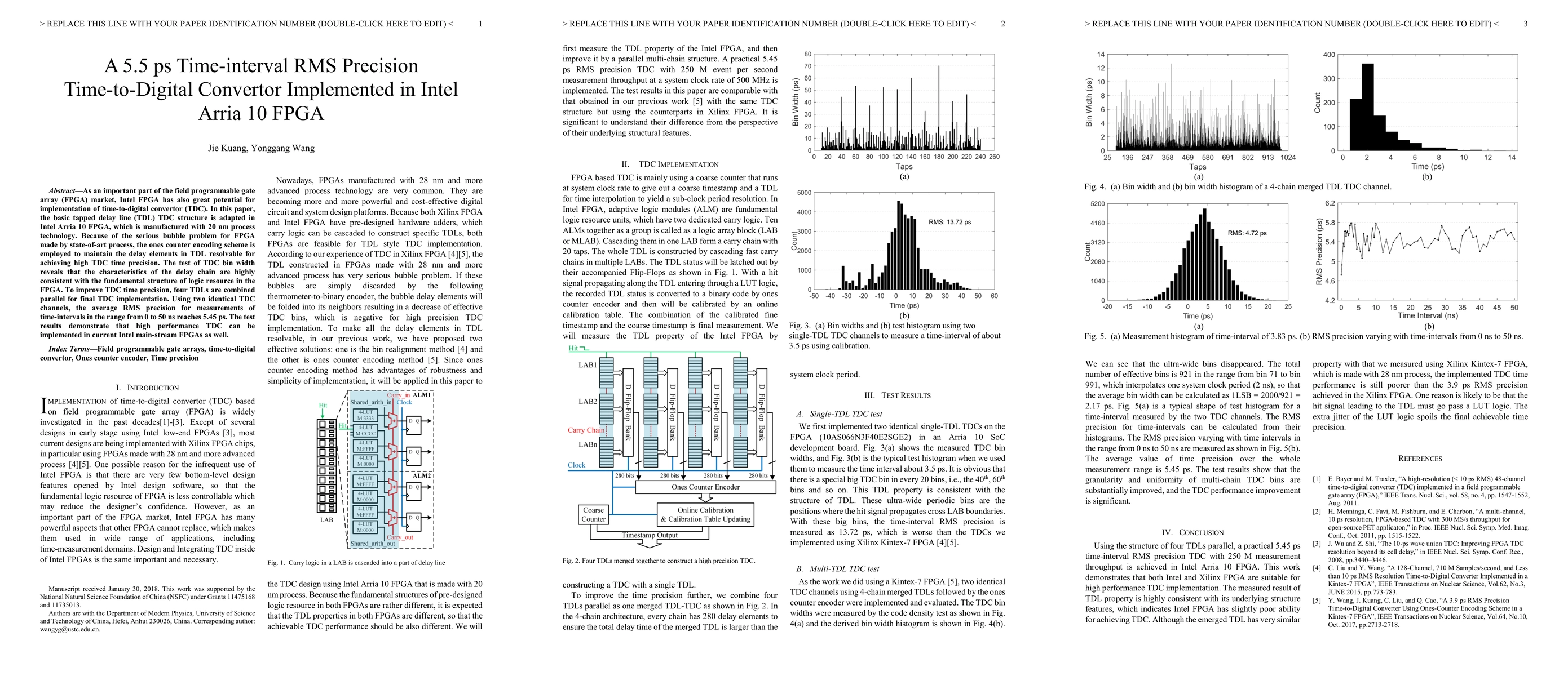 The paper presents a TDC design using ones counter encoding in Intel Arria 10 FPGA, achieving 5.45 ps RMS precision with a parallel multi-chain structure.