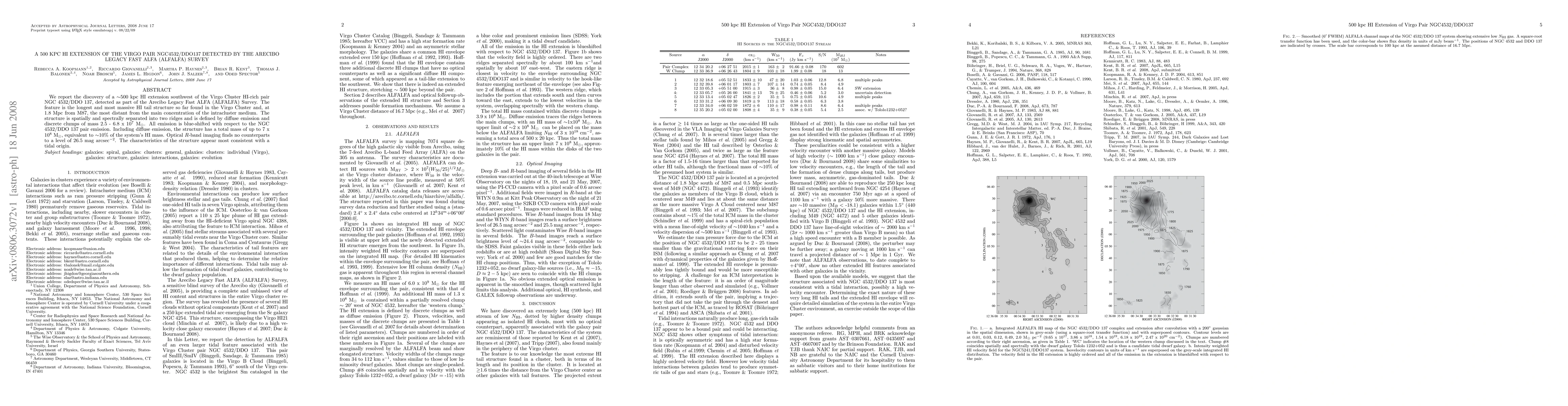 The ALFALFA Survey discovered a ~500 kpc HI extension southwest of the Virgo Cluster's NGC 4532/DDO 137 pair, the longest and most massive HI tail in the cluster, with a total mass of up to 7 x 10**8 solar masses, likely formed through tidal interactions. No optical counterparts were found.