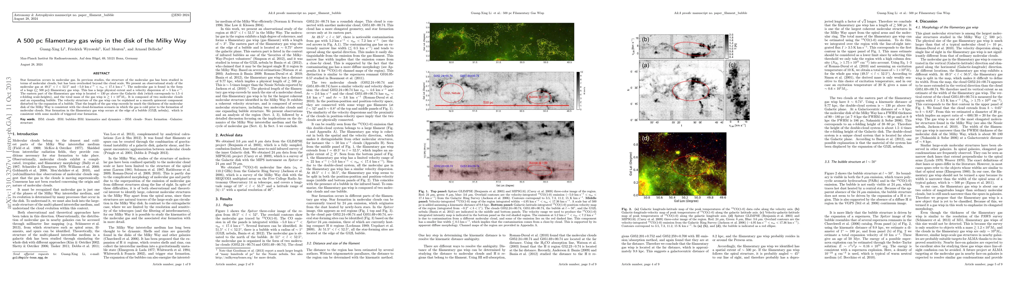 A large filamentary gas wisp in the Milky Way's disk has been discovered, composed of two molecular clouds and an expanding bubble, with a mass of over 10^5 solar masses.