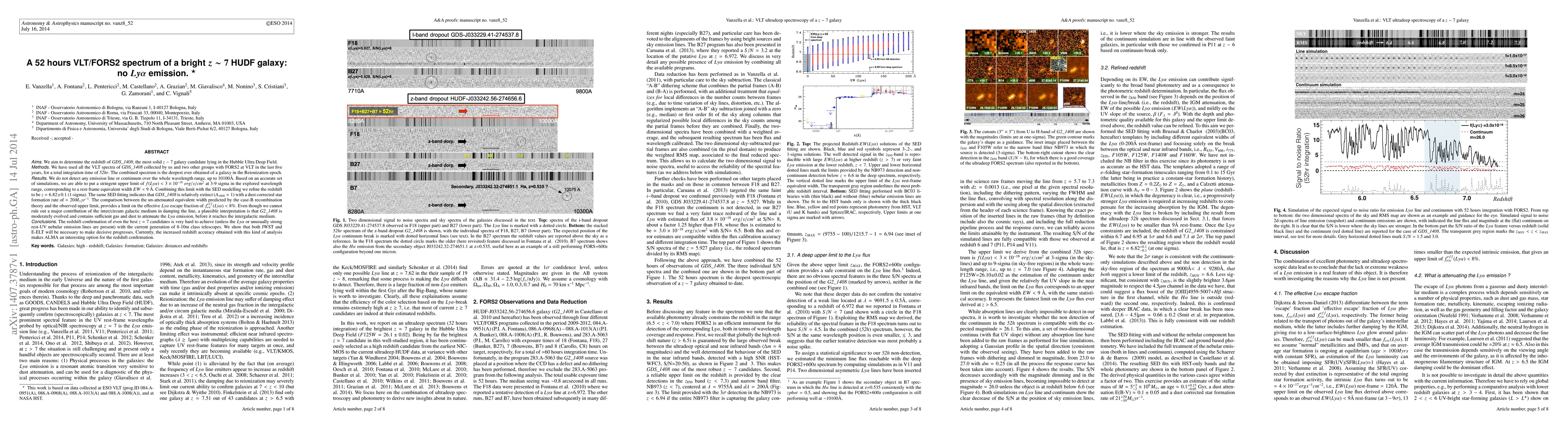 We aim to determine the redshift of GDS-1408, the most solid z~7 galaxy candidate lying in the Hubble Ultra Deep Field. We have used all the VLT spectra of GDS-1408 collected by us and two other groups with FORS2 at VLT in the last five years, for a total integration time of 52hr. The combined spectrum is the deepest ever obtained of a galaxy in the Reionization epoch. We do not detect any emission line or continuum over the whole wavelength range, up to 10100A. Based on an accurate set of simulations, we are able to put a stringent upper limit of f(Lya)<3x10^(-18) erg/s/cm2 at 3-9 sigma in the explored wavelength range, corresponding to a rest-frame equivalent width EW<9A. Combining this limit with the SED modelling we refine the redshift to be z=6.82+/- 0.1 (1-sigma). The same SED fitting indicates that GDS-1408 is relatively extinct (A1600~1) with a dust corrected star formation rate of ~ 20 Msol/yr. The comparison between the un-attenuated equivalent width predicted by the case-B recombination theory and the observed upper limit, provides a limit on the effective Lya escape fraction of f_(esc)^(eff)(Lya)<8%. Even though we cannot rule out a major contribution of the inter/circum galactic medium in damping the line, a plausible interpretation is that GDS-1408 is moderately evolved and contains sufficient gas and dust to attenuate the Lya emission, before it reaches the intergalactic medium. The redshift confirmation of even the best z~7 candidates is very hard to achieve (unless the Lya or unusually strong rest-UV nebular emission lines are present) with the current generation of 8-10m class telescopes. We show that both JWST and E-ELT will be necessary to make decisive progresses. Currently, the increased redshift accuracy obtained with this kind of analysis makes ALMA an interesting option for the redshift confirmation.